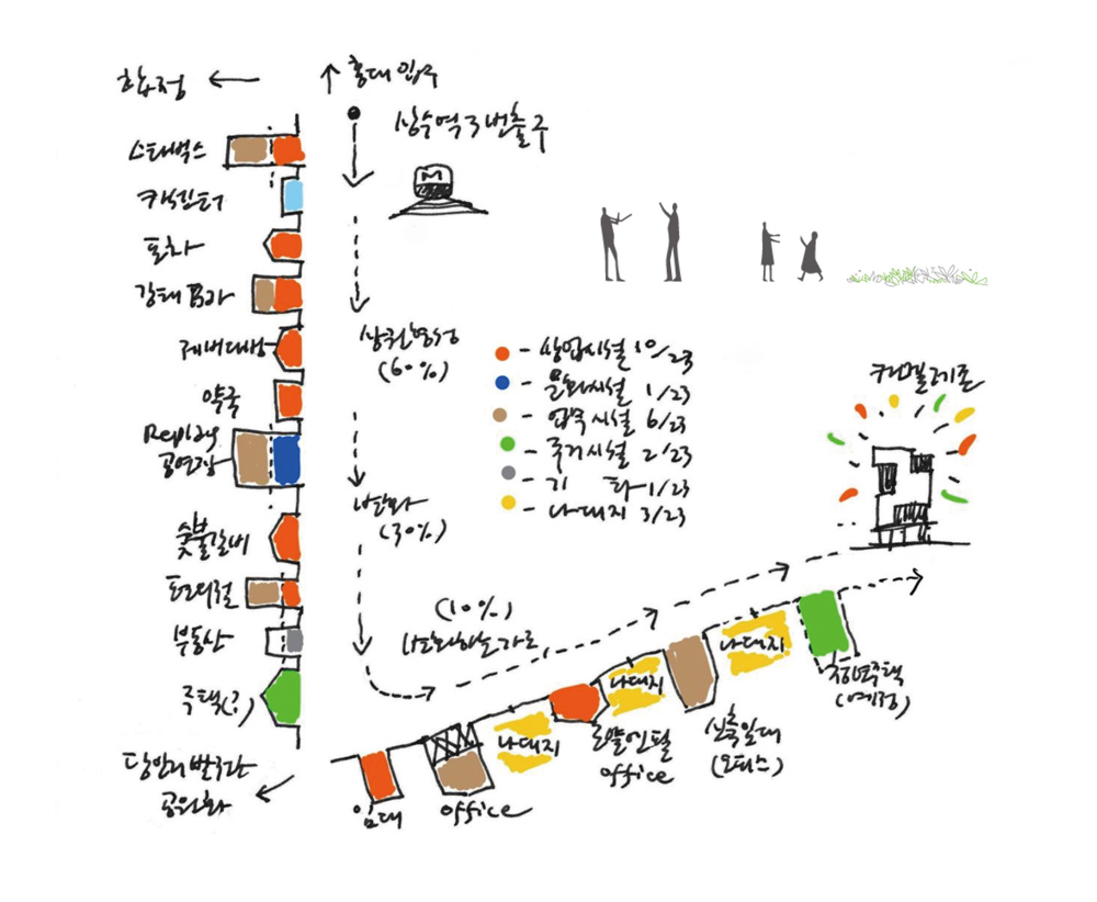 오래된 동네의 지적선은 다양한 레벨과 함께 사선제한으로 규제되어 건축을 못하게 되는 공간들이 자연스럽게 생겨났고, 우연히 발견된 이 공간들은 옛날동네의 가로와 많이 닮아 있어서 오히려 장소의 정체성을 찾는데 도움이 되었을 것으로 본다.