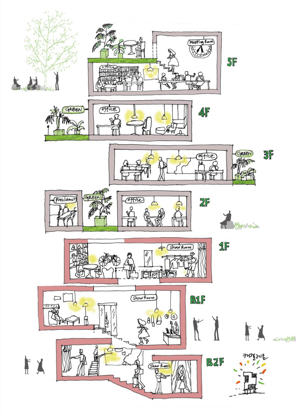 더구나 각층에 골고루 분포되어 각각의 공간마다 조망, 채광, 또는 부피감등으로 사용자와 친밀한 공간이 될 것이다. 이 공간들은 변화에 대응하는 건축의 중요한 역할을 할 것으로 기대한다.