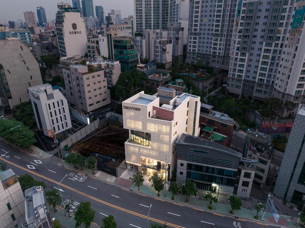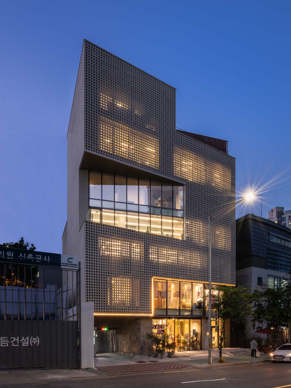 Irregular lot lines created rather dynamic plans, which are naturally developed into three-dimensional cross-sections. From my experiences that it is challenging to standardize the exterior materials of an irregular mass building, we decided brick as the primary material. Brick is meaningful as humanity's first building material. Furthermore, It's a beautiful material to be applied to this building in that small cells gather to form a mass. It was also a suitable material to form a translucent layer on the south side facing a street, depending on a brickwork method. After careful consideration, we used so-called white Gauguin bricks made of baked white bricks as the primary material. The façade translucent layer had a masonry structure of perforated brickwork. We decided to develop a new material because the safety of the opening scale and the masonry of the 5th-floor height were not proven. We developed a new type of brick, C Block, with white soil with the same physical properties and a translucent feeling (with a more full opening, instead of perforated brickwork). This material, which covers almost all of the façade, was developed together with WooSung Brick. Studying structural stability was interesting, and is expected to have a significant influence on future projects.
