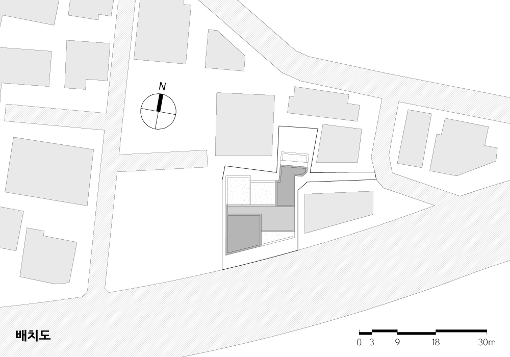 오래된 동네의 지적선은 다양한 레벨과 함께 사선제한으로 규제되어 건축을 못하게 되는 공간들이 자연스럽게 생겨났고, 우연히 발견된 이 공간들은 옛날동네의 가로와 많이 닮아 있어서 오히려 장소의 정체성을 찾는데 도움이 되었을 것으로 본다.