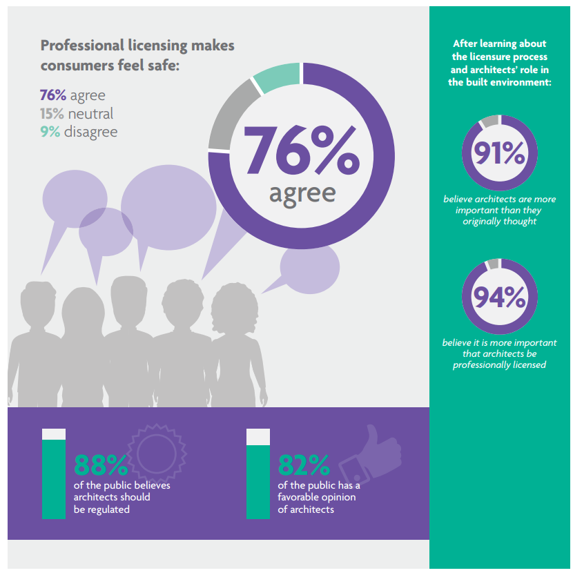 미국건축사등록원(NCARB)는 해마다 건축사등록에 관련된 매우 광범위한 통계자료를 조사하고 이를 무료로 대중에게 공개한다. 모든 통계 내용은 그래픽으로 시각화돼 있어 그 내용을 알기 쉽게 전달하고 있다. 그 중에서 주목할 만한 내용은 일반 시민을 대상으로 하는 건축사에 대한 인식 설문조사이다.