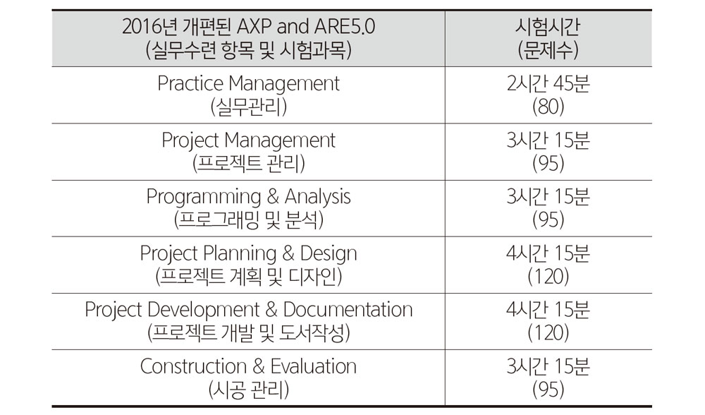 미국 실무수련 항목과 시험과목에도 유의미한 변화가 있는데 과거엔 건물을 구축하는 계획적 측면과 이를 뒷받침하는 시스템의 이해를 측정하는 내용이 주를 이루었다면 변화된 내용에는 프로젝트 관리항목이 보완되면서, 단순한 건물설계의 직능적인 측면에서 프로젝트 베이스의 기획에서 최종완성까지의 유기적 관계를 측정하는 것으로 건축사업무가 재편되고 있음을 보여주고 있다.