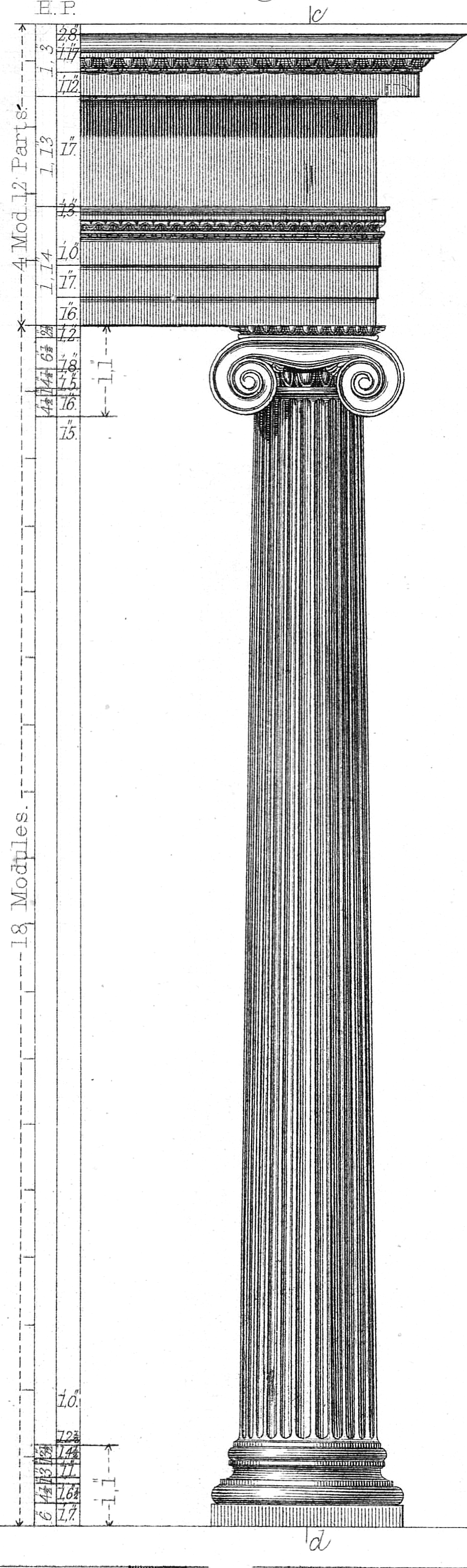 이렇게 유럽의 고전 건축에서는 엔타블라처의 맨 윗부분인 코니스부터 기둥의 맨 밑인 베이스에 이르기까지 수많은 몰딩들이 반복해서 나타난다.<사진 3> 이 이오니아식 오더(order)에서 코니스, 프리즈, 아키트레이브는 각각 세 부분으로 나뉘는데, 나뉘는 부위마다 몰딩이 있다. 긴 기둥의 반복적인 세로 줄무늬인 플루팅 역시도 몰딩 장식의 일종이다. 유럽의 고전 건축은 몰딩의 건축이라고 해도 지나친 말이 아니다.