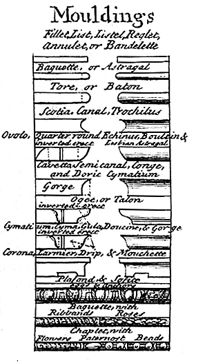 사전에서 정의하는 몰딩(molding)은 건축 표면에서 돌출되거나 함몰된 연속적인 띠를 말한다.<사진 1> 기능적으로 몰딩은 어떤 요소가 다른 것으로 바뀌는 중간단계(transition)를 덮으려는 목적을 갖는다. 몰딩은 건축의 외관에서 시작되었다. 예를 들어 고전 건축의 기둥에서 주초(base)는 상단 토루스(upper torus)와 하단 토루스(lower torus)로 구성되어 있고, 그 사이에는 ‘스코티아(scotia)’라는 전환점이 있다.<사진 2> 스코티아는 오목 몰딩에 해당한다. 스코티아는 위로는 상단 토루스와 만나고, 밑으로는 하단 토루스와 만난다. 스코티아가 토루스와 만나는 지점에도 전환점으로서 돌출된 몰딩이 있다. 이 몰딩을 ‘필레(fillet)’라고 한다. 스코티아도 몰딩이지만, 스코티아가 토루스와 만나는 지점 역시도 몰딩인 것이다.