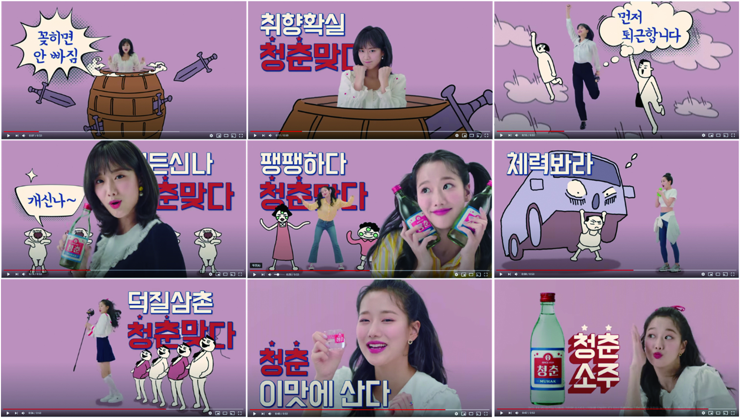 영상 속에서 건강미 넘치는 모델은 경쾌한 춤과 발랄한 표정, 장난끼 넘치는 카피로 청춘이 가지는 특성을 보여주고 공감을 유도한다. 재미있는 일러스트와 빠른 편집, 중독성 있는 리듬이 광고가 아니라 만화를 보는 것 같은 느낌을 준다. 취향이 확실하고 칼퇴근을 추구하며, 뭐든 신나고 ‘덕질’에 주저하지 않는다면 나이가 들었어도 ‘청춘’이라고 광고는 반복해서 강조하고 있다. 2030세대는 물론, 모든 세대의 생활 속에서 ‘청춘’을 공감할 수 있는 에피소드를 엮었기에 영상 제목도 ‘2040 편’이라고 달았다. 무학의 ‘청춘 콘텐츠’는 유튜브 공개 후 두 달여 만에 300만에 가까운 조회수를 돌파하는 뜨거운 반응을 얻고 있다.