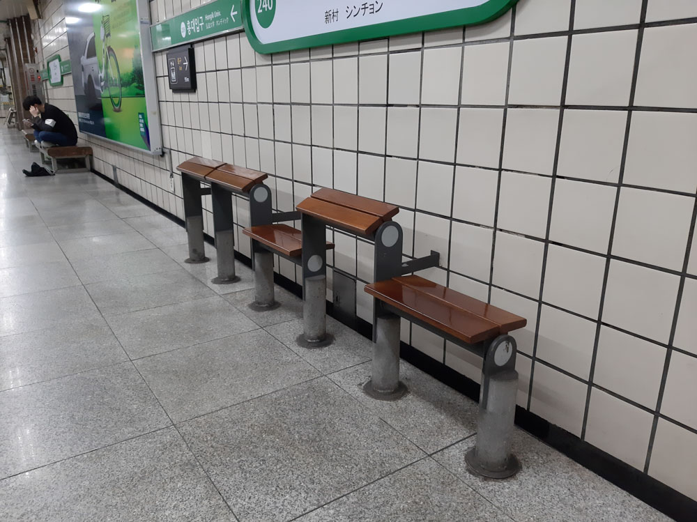 K 그런데 ‘노숙자’ 하면 제일 먼저 떠오르는 서울역을 생각해봐. 요즘에는 인천공항까지도 노숙인들이 점령하고 있대. 이런 경우에는 차라리 오랜 시간 머무르기 불편해지는 게 사회적으로 도움이 되지 않을까? 적대적인 디자인이 불친절하다는 이유로 그저 편하고 열려있는 장소만 늘린다면, 오히려 노숙자가 늘어나고 일반인들이 이용하기에 거부감이 드는 공간으로 바뀌고 말지도 몰라.