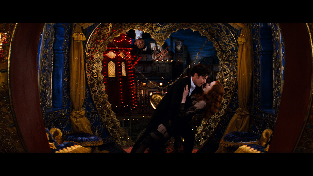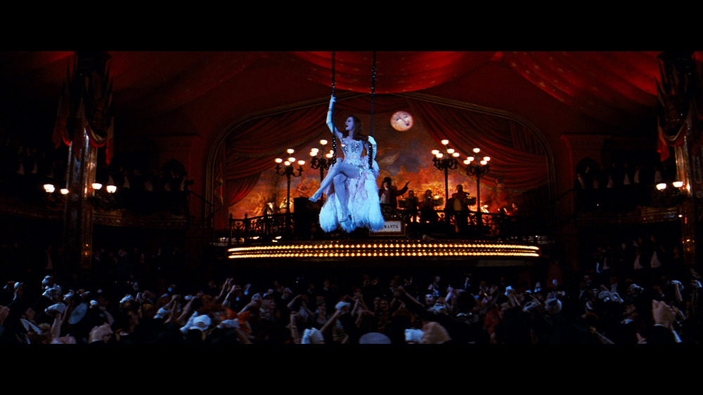 물랑루즈가 있는 몽마르뜨 지역은 파리에서 비교적(?) 가난한 빈민 계층 거주지와 인접한 탓에 그다지 우아하고 매력적이고 고급스러운 곳은 아니다. 관광가이드만 보더라도 이 지역에 대한 경고(소매치기 같은)가 있을 정도다. 이러한 배경은 영화의 흐름 속에서 나타나는 시각적 키치적 구성을 통해서도 이해할 수 있다. 굳이 우아하거나 지적으로 보이려고 하지 않는다. 마냥 좋은 게 좋은 것이라는 막연한 인식에 바탕을 둔 아름다움. 싸구려 반짝이로 만든 화려한 의상들은 과장됐고, 오히려 신체의 가장 민감한 부분들을 강조하고 드러냄으로써 인간의 욕망을 자극하고 있다. 샤틴 같은 무희들을 향한 대중들의 열광은 인간에 대한 진정한 감동이 아니라 단지 성적 대상에 대한 흥분인 것이다. 당연하게 무희의 기쁨과 웃음 이면에는 그럼에도 살아야 하는 슬픈 생존의 현실이 숨어 있다. 비록 영화가 비토리오 데시카 감독 같이 사실주의적으로 접근한 것은 아니지만, 이 같은 현실을 인식하고 드러내기는 한다. 다만 현실의 냉정함을 잊을 수 있는 마치 마약 같은 환상적 이미지들로 영화를 구성했다. 영화의 공간 역시 싸구려 반짝이와 가짜 보석들로 즐비하게 장식한 무희들처럼 온갖 장식들로 치장돼 있다. 기능을 중심으로 한 단순하고 절제된 공간이 아니라 감성적이고 즉흥적인 치장된 공간, 논리보다는 감성적인 장식들의 공간이다. 자극적인 감성을 자극하는 것 중 하나가 키치라고 한다면, 영화를 가득 메운 화려한 이미지들은 ‘단지 아름다움을 체험했다’ 정도의 막연한 느낌으로 대중에게 만족감을 준다.