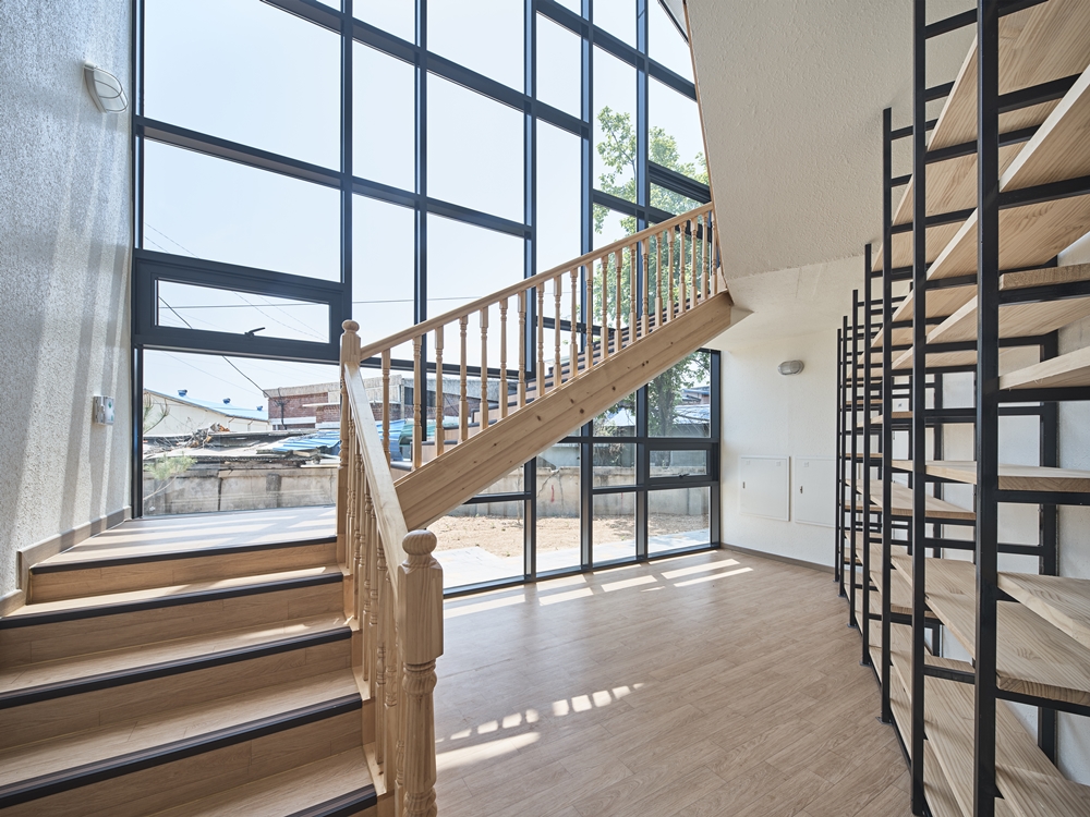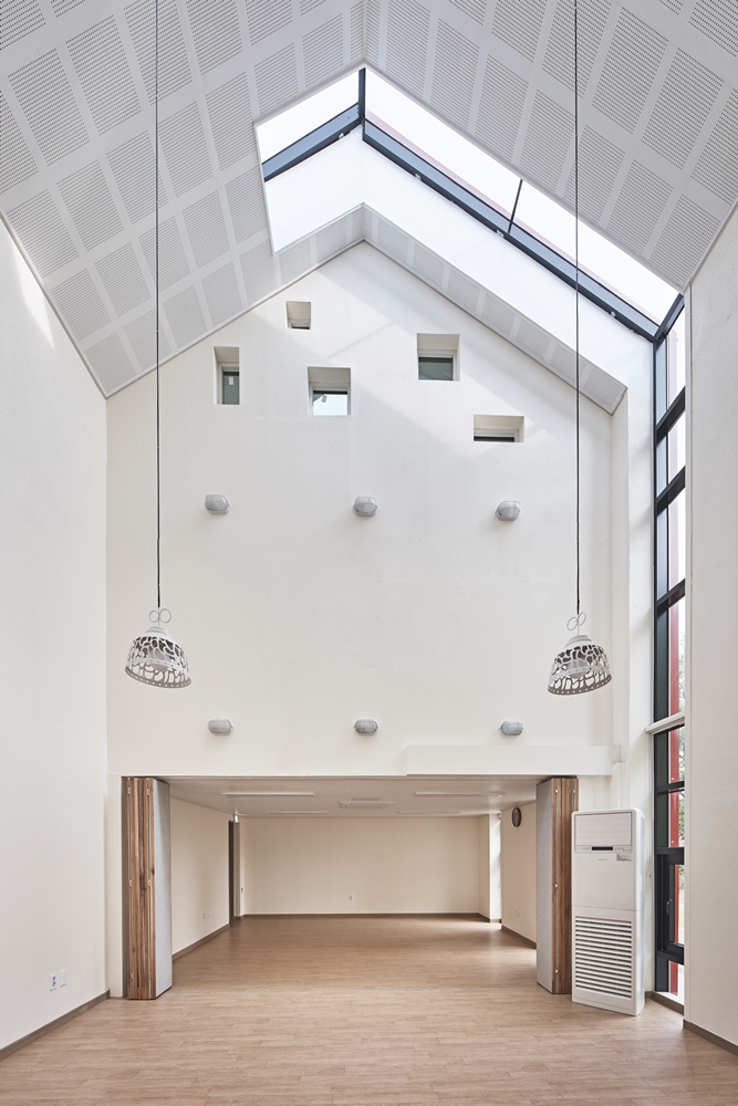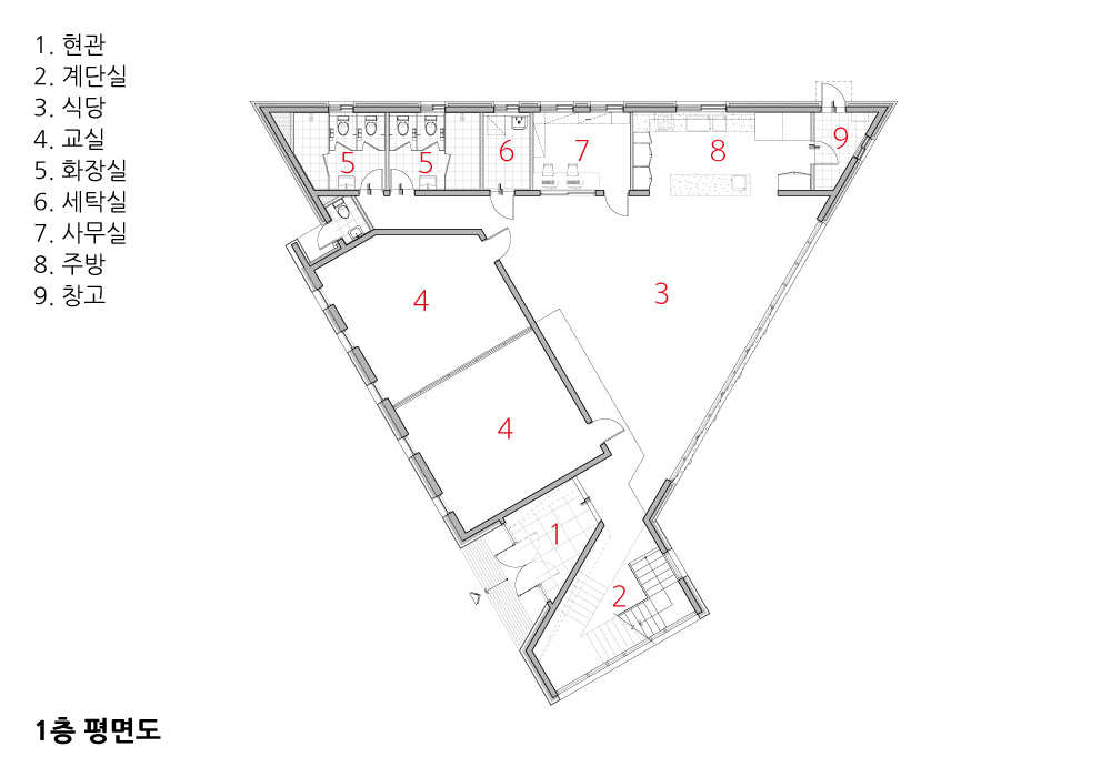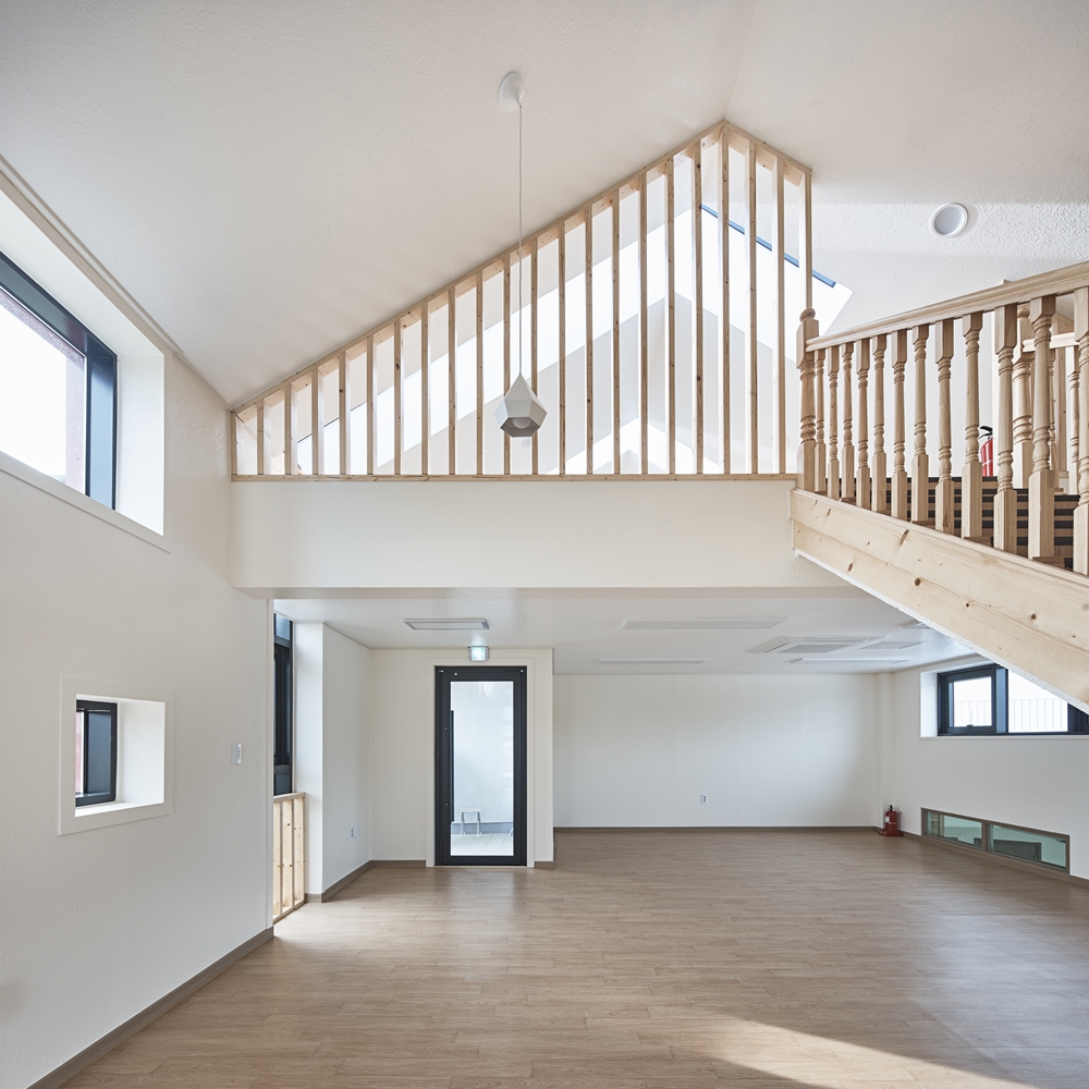The local community children's center in Okcheon has a different start compared with other places. It is one of the projects that have been progressed for years at SBS as a part of its social contribution project to inspire dreams and hopes of children in the alienated class. The children in Cheongsan-myeon were spending the days of summer vacation being absorbed in computer games and playing with smartphones at the site we visited in the hot weather of over 30C. The first task was to prepare their own safe, diverse, and unique place for play. The four front gardens and five playing spaces were proposed. The playground, which is transformed into a space for water play in summer, for snow play in winter and sometimes for a ball play, is connected to the Cheongsan Youth Culture House to become a place for children to stop by to and from school naturally. The relationship between children's centers and a local community is made through the shared yard linked to a multi-purpose space and the dream yard that anyone can rest under cherry trees. The most playing spaces that children can experience were proposed indoor. Space created by considering various behavioral patterns such as breadth, grandeur, narrowness, depth, high, low, bright, dark space, etc. will sufficiently stimulate children's curiosity. A sunny stairway library, a playroom of the second floor that can be explored from all the indoor spaces, and a dreaming attic under a large skylight, where the night sky galaxy can be counted, become a space for children to cultivate their dreams. The stereotyped triangular mass becomes an icon of this area, and the internal space under the gabled roof becomes a communication space for children to have many dreams.