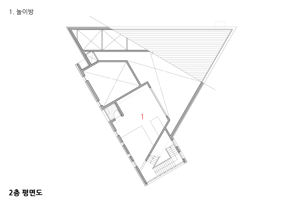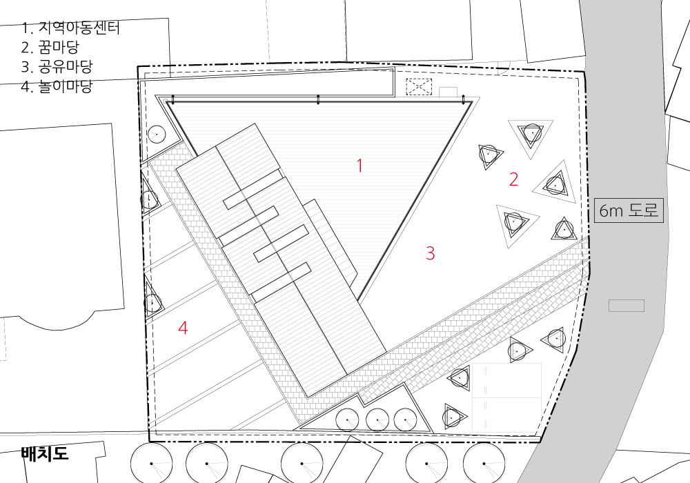 아동센터와 지역의 관계 맺음은 다목적 공간과 연계된 공유마당과 벚나무 아래 쉴 수 있는 꿈마당을 통해 이루어진다. 실내에는 아이들이 체험할 수 있는 가장 많은 놀이공간을 제안했다. 넓음, 웅장함, 좁음, 깊음, 높음, 낮음, 밝음, 어두운 공간 등등 다양한 행동 패턴을 대입하여 만들어진 공간은 아이들의 호기심을 충분히 자극할 것이다. 햇살이 잘 드는 계단도서관, 실내의 모든 공간으로 탐방이 가능한 2층의 놀이실, 커다란 천창 아래 밤하늘 은하수를 헤아려볼 수 있는 꿈꾸는 다락은 아이들이 꿈을 키우는 공간이 된다. 삼각형의 정형화된 매스는 이 지역의 아이콘이 되며, 박공지붕 아래 내부공간은 다양한 꿈을 꾸게 하는 아이들의 소통공간이 된다.