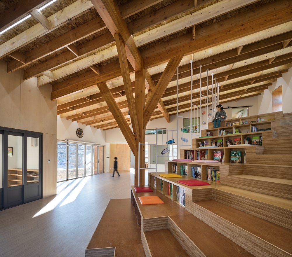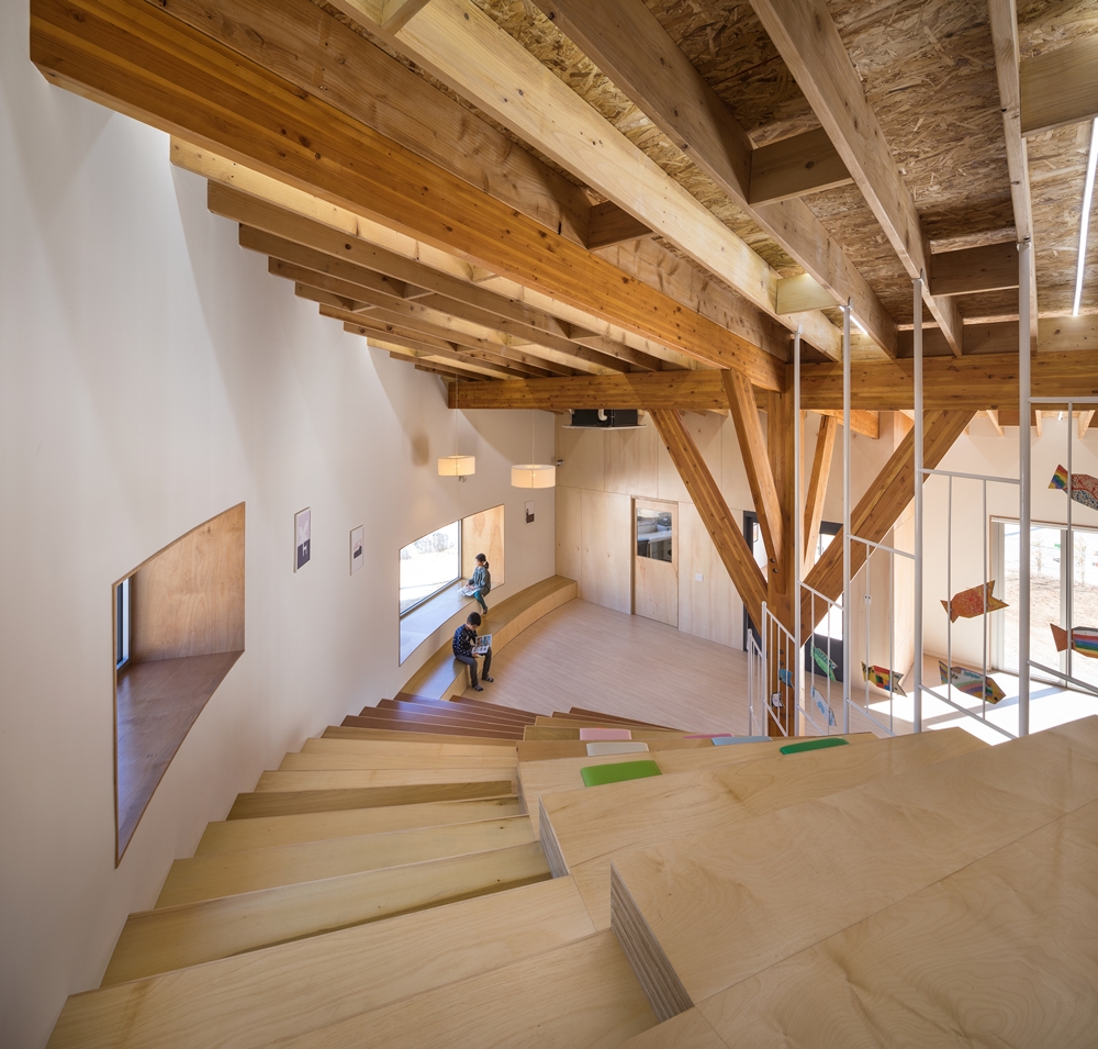 Stairs naturally lead the children to the secret second-floor space. The stairs where they can read books, large and small pocket windows, leading to an attic with the fluffy floor surround the multipurpose room. A large wooden pillar spreads out from the ceiling where the wooden structure is exposed. While climbing the attic, you will encounter the scenery of the village and the sky through different windows that jut out.
