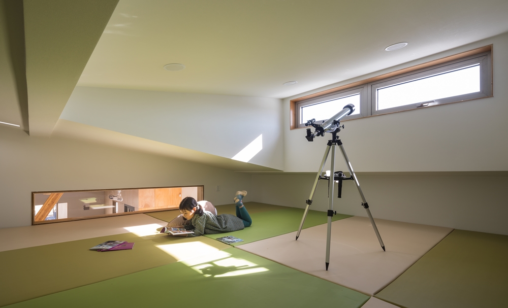 아이들을 비밀스러운 2층 공간으로 자연스레 이끌 수 있도록 계단을 이용했다. 책을 읽을 수 있는 계단, 크고 작은 포켓 창, 바닥이 푹신한 다락으로 이어지는 공간은 다목적실을 감싼다. 목구조가 노출된 천장으로는 커다란 원목 기둥이 펼쳐져 있다. 다락을 오르는 동안에는 밖으로 돌출된 제각기 다른 창을 통해서 마을의 풍경과 하늘을 만나게 된다.