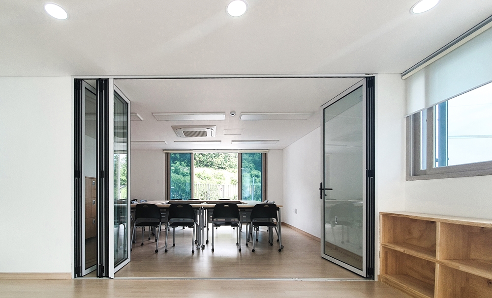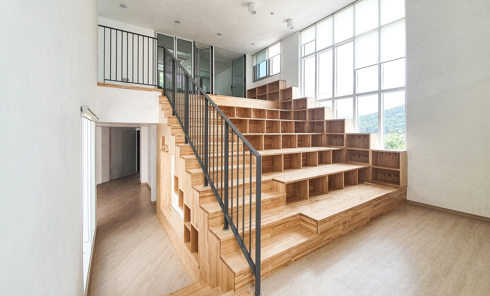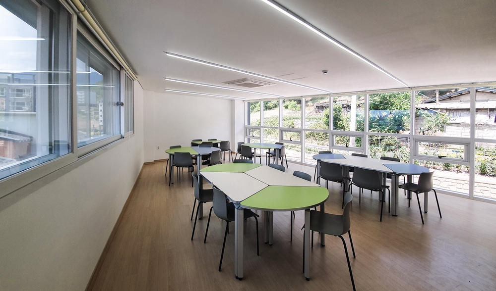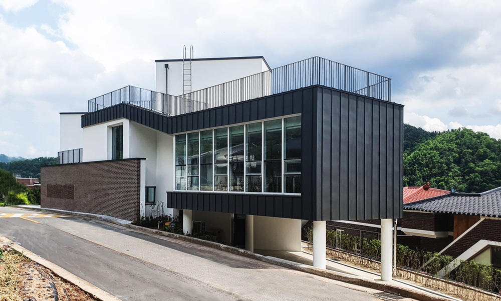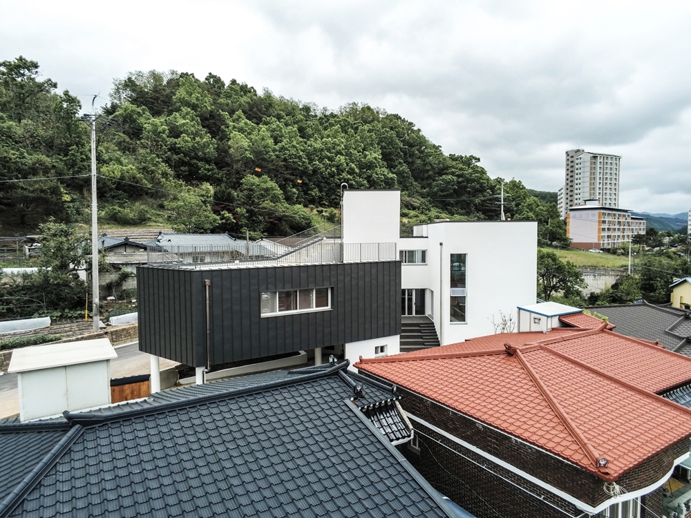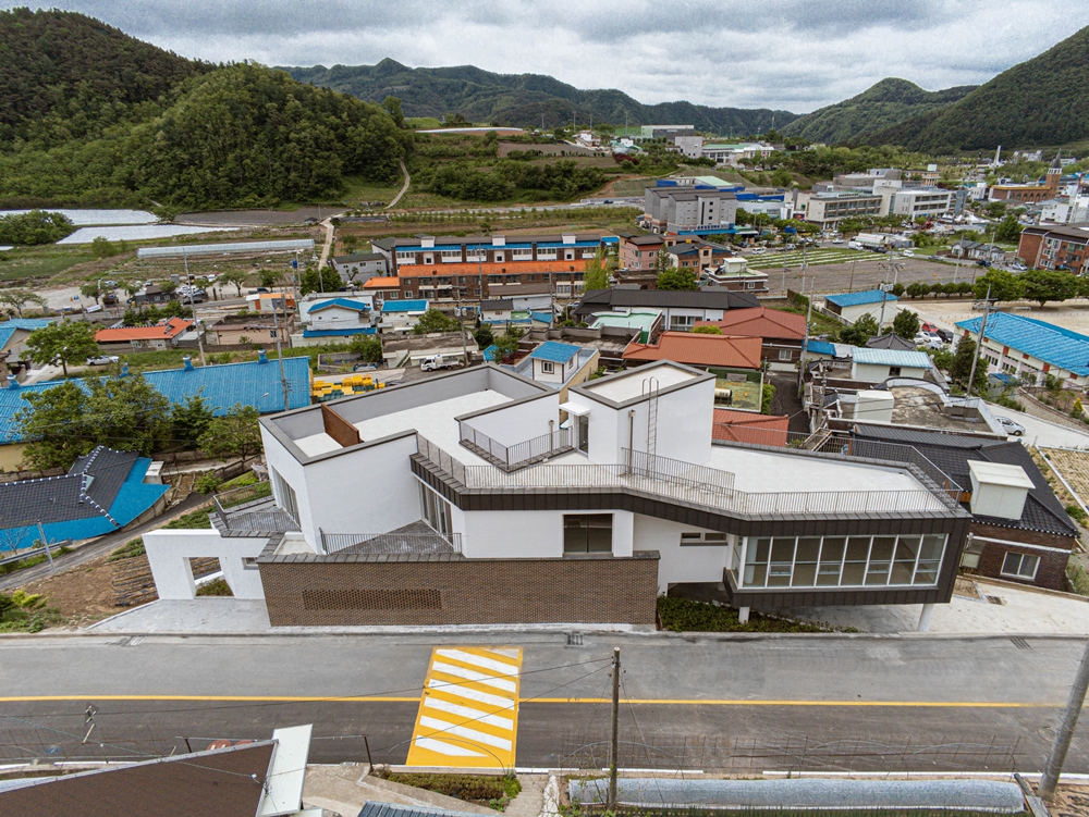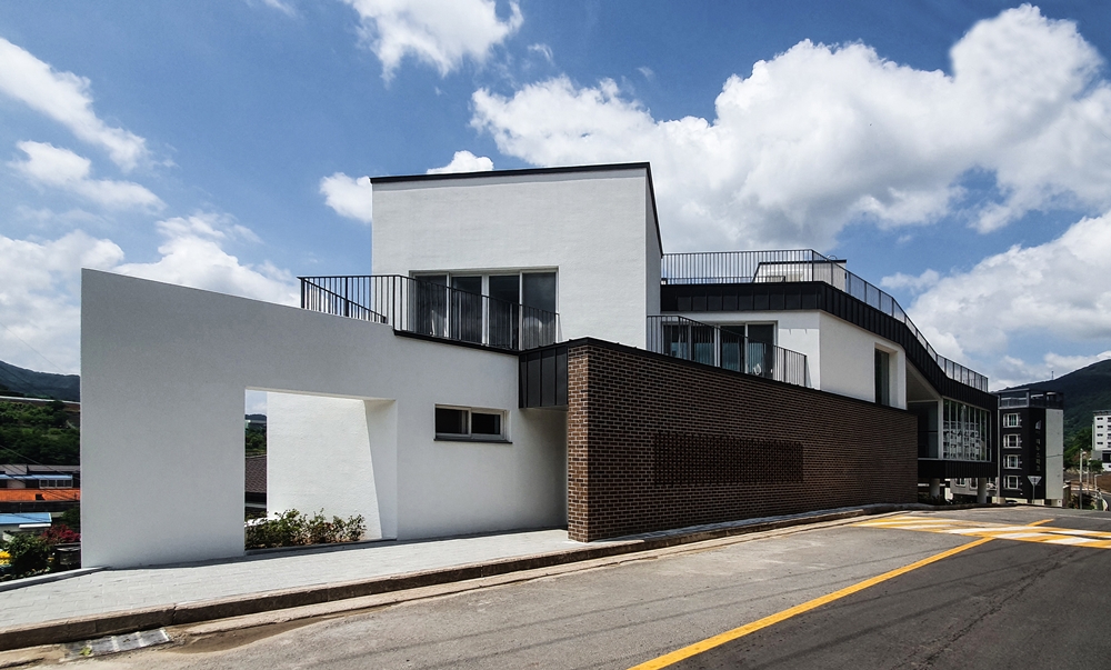 Using the various axes and slopes of the triangular site, the entry level is divided into two places and space was formed in skip floor format. There are screens that keep children safe along the road boundaries and the courtyard was built to form a 'ᄃ'-shaped in that space. Skip floor format and the courtyard allow children to walk up and down and wondering around freely as walking along the prominade. The building was designed to be a local children's center where children can enjoy playing, relaxing and learning. To increase the utilization of limited interior space, we designed the interior space for multiple purposes. The outer form of the architecture is that the composition and volume of the interior space are natural from the outside, and designed to be revealed and harmonized. The interior space consists of natural wood and white paint. The exterior landscape and natural lighting were attracted to make it a bright and diverse space. The local children's center in Yeongyang-gun has children who are free to run around and dream of the future. It's a space for. We hope that children who use local children's centers in Yeongyang-gun will enjoy the space and be happy.