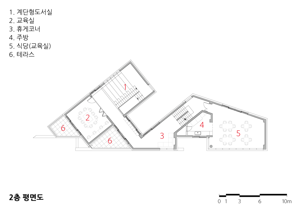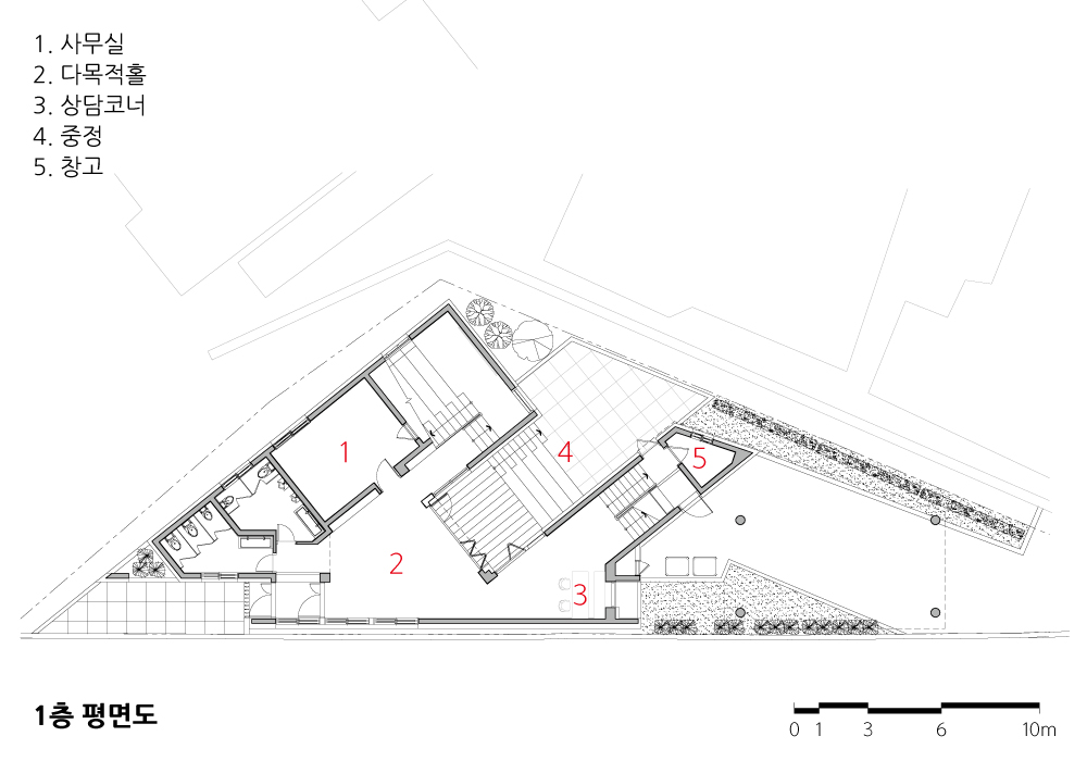 삼각형 대지의 다양한 축과 경사를 이용해 진입 레벨을 두 곳으로 구분하고 스킵플로어 형식으로 공간을 구성했다. 아이들의 안전을 고려해 도로 경계에 치장벽돌 마감 벽체 스크린을 설치했으며, 중정 마당은 ‘ㄷ’자 형태의 위요된 공간으로 만들었다. 스킵플로어 형식과 중정 형태의 건축 공간을 통해서 아이들이 산책하듯 오르락내리락 자유롭게 돌아다니며 놀이와 휴식, 학습을 즐길 수 있는 지역아동센터가 될 수 있도록 계획했다. 또 한정된 내부 공간을 다목적으로 활용할 수 있도록 건축의 외부 형태와 내부 공간의 구성· 볼륨이 외부로도 자연스럽게 드러나고 외부와 조화될 수 있도록 했다. 내부 공간엔 자연 소재인 목재와 흰색 페인트를 사용했고, 외부 경관과 자연 채광을 최대한 끌어들여 내부 공간을 밝고 다양한 공간으로 연출될 될 수 있도록 했다.