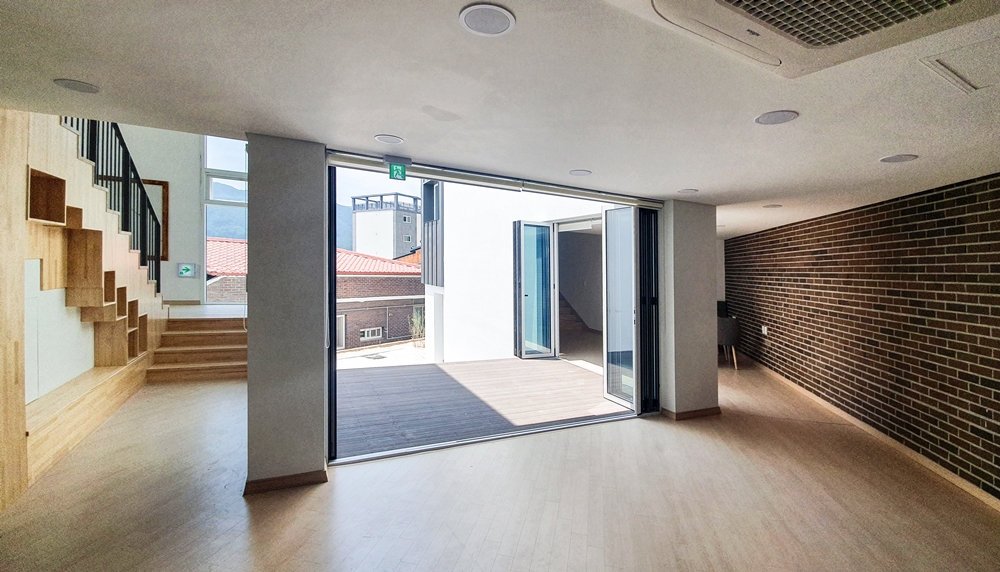 Using the various axes and slopes of the triangular site, the entry level is divided into two places and space was formed in skip floor format. There are screens that keep children safe along the road boundaries and the courtyard was built to form a 'ᄃ'-shaped in that space. Skip floor format and the courtyard allow children to walk up and down and wondering around freely as walking along the prominade. The building was designed to be a local children's center where children can enjoy playing, relaxing and learning. To increase the utilization of limited interior space, we designed the interior space for multiple purposes. The outer form of the architecture is that the composition and volume of the interior space are natural from the outside, and designed to be revealed and harmonized. The interior space consists of natural wood and white paint. The exterior landscape and natural lighting were attracted to make it a bright and diverse space. The local children's center in Yeongyang-gun has children who are free to run around and dream of the future. It's a space for. We hope that children who use local children's centers in Yeongyang-gun will enjoy the space and be happy.