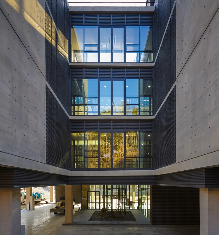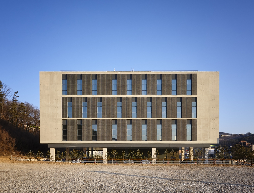 The open space and courtyard were planned to bring the green axis on the north side to the center of the building, and the production zone and work zone were vertically separated to increase work efficiency. The Dongtan office building, consisting of five floors, gave a design highlight points of vertical louvers and front bricks on the exposed concrete front facade, and was designed to match the greenery background and bamboo plantation at the courtyard. When you enter the courtyard past the entrance, a nicely opened up courtyard welcomes people by means of expansion of the natural scenery.