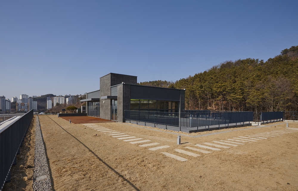 In order to draw natural light into the hallway facing the courtyard, it was closed with a full height glass curtain wall, and thanks to this, it gives a bright and open atmosphere instead of a tightly dense corridor feeling. Due to the whole glass curtain wall covered courtyard, this place acts as a new type of public space where city and nature, work and relaxation coexist, and it can be felt in the hallway of each floor. The folding door installed in front of the 5th floor rest facility is pivotal role for communication in and out of the space, making the rest facility expandable to the entire roof garden. These two spaces are linked to increase comfort and utilization of facility . Songdo Industrial Co., Ltd. Dongtan Office hopes to reach everyone with a picture in the frame of concrete and a brick factory on green grass and a blue sky.