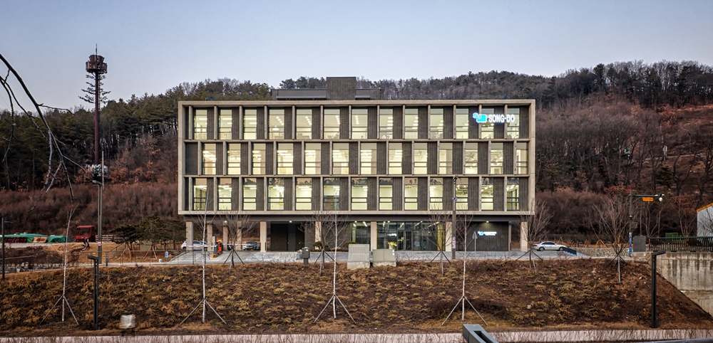 중정과 맞닿은 복도에 자연광을 끌어들이기 위해 전면창으로 마감하였고, 덕분에 밀도 높은 공간이 아닌 밝고 개방감이 넘치는 공간이 만들어졌다. 전면유리 커튼월 중정으로 인해, 이 곳은 도시와 자연, 업무와 휴식이 공존하는 새로운 유형의 공공공간으로 작용하며, 이것은 각층의 복도에서 그대로 느낄 수 있다. 5층 휴게시설 전면에 설치된 폴딩도어는 내외부 공간의 소통을 담당하여 휴게시설이 옥상 정원 전체로 전개되는 확장성을 갖게 한다. 두 공간은 상호 연계되어 쾌적성과 더불어 공간의 활용성을 높이는 역할을 한다. (주)송도산업 동탄사옥은 푸른 잔디 위 콘크리트와 전벽돌 공장, 파란 하늘은 하나의 액자 속의 그림으로 모두에게 다가오기를 희망한다.