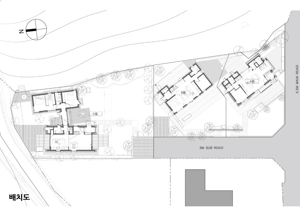 | 어쩌다이웃@두동 설계자 | 김성준_(주)건축사사무소 위(WEE) 건축주 | A동 _ 조자영 / B동 _ 이리나 / C동 _ 노상득 감리자 | 김성준 _ (주)건축사사무소 위 시공사 | 이주형 _ (주)아이엔건설 설계팀 | 김휘원, 전행아, 강은엽, 송주연, 주정영, 채우리 대지위치 | 울산광역시 울주군 두동면 이전천변길 주요용도 | A동 _ 단독주택+근생 / B동 _ 단독주택 / C동 _ 단독주택 대지면적 | A동 _ 305.00㎡ / B동 _ 305.00㎡ / C동 _ 586.00㎡ 건축면적 | A동 _ 60.96㎡ / B동 _ 60.93㎡ / C동 _ 109.81㎡ 연면적 | A동 _ 210.29㎡ / B동 _ 121.86㎡ / C동 _ 99.81㎡ 건폐율 | A동 _ 19.99% / B동 _ 19.98% / C동 _ 18.74% 용적률 | A동 _ 39.76% / B동 _ 39.95% / C동 _ 17.03% 규모 | A동 _ 지하 1층, 지상 2층 / B동 _ 지상 2층 / C동 _ 지상 1층 구조 | 철근콘크리트조 외부마감재 | 청고벽돌, 외단열시스템 내부마감재 | 친환경 페인트(티쿠릴라) 설계기간 | 2015. 07 ~ 2016. 01 공사기간 | 2016. 01 ~ 2016. 07 사진 | 김휘원, 김성준 구조분야 : 은구조 |