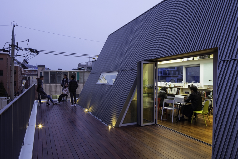북쪽을 향하는 벽체가 사선으로 구성된 4층은 일부 공간을 테라스로 활용, 모든 직원들이 자유롭게 쉴 수 있도록 했다. 4층은 내 외부를 완전히 분리하기보다 서로 적당하게 교체되면서 숨 쉴 수 있는 공간으로 구성했다. 이것은 평소 UTAA 건축사사무소가 염두에 두고 있는 공간 철학이 물리적으로 드러난 것이다. 3층과 계단으로 이어진 이 공간은 때에 따라 세미나실로, 또는 클라이언트와의 미팅을 위한 공간으로 활용할 수 있도록 했다.