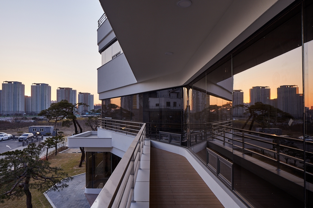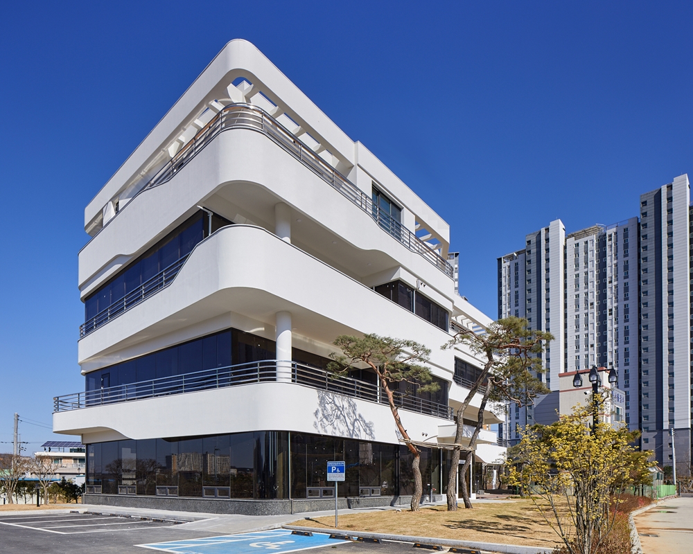 The wind of development began to blow in Pyeongtaek, known as a flat and fertile breadbasket from old times. Although buildings are going up around this area, J Residential-Commercial Building is open to all sides, except for the apartment complex, which is far away. It commands an unobstructed view of the vast field in the northwest. The client wanted a multi-family house that is different from uniform residential-commercial buildings, and their children's generation can live together. A harmonious elevation between commercial and residential spaces was required.