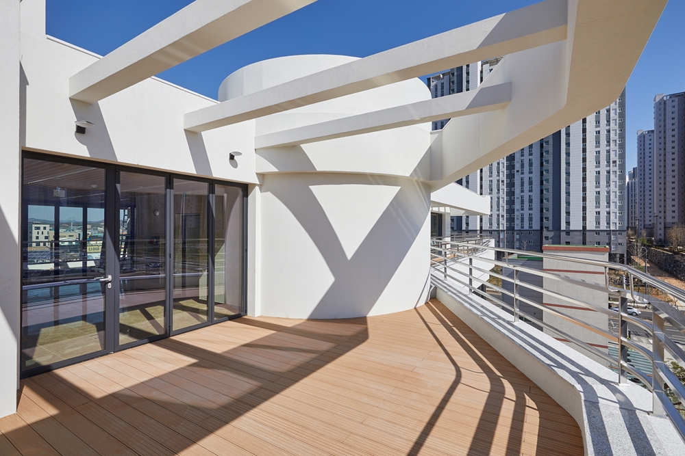 계단실은 유선형과 원형이 혼합된 형태로 계획했다. 자재는 아쿠아패널이라는 흔치 않은 재료를 선택했는데 둥근 모서리와 곡선의 입면을 구현하고 동시에 외벽줄눈을 피하길 원하는 건축주의 특별한 요구사항에 맞추기 위함이었다. 4층 부부세대와 자녀세대 사이의 넓은 홀과 옥외데크는 가족세대간의 커뮤니티 공간이면서, 내·외부로 열린 조망성을 갖는 소통과 휴식의 공간이다.