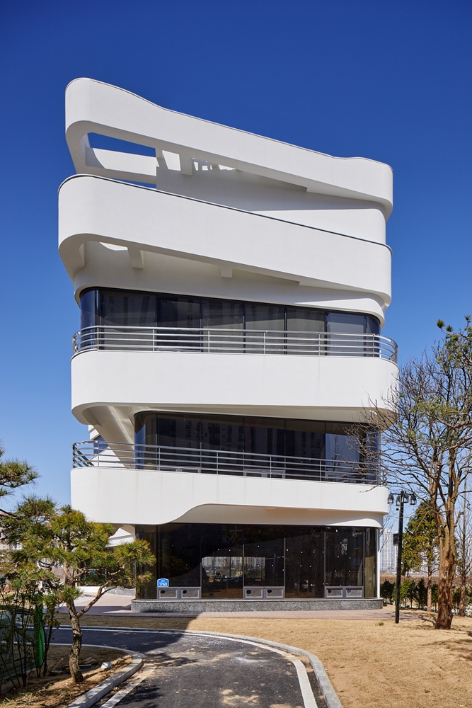The base plan follows a shape from several directions of axes derived from the site sitting aside the street. Afterward, the forms of various plates unfolded differently from the direction were developed as masses for each floor. The streamlined staircase was united into a design located in the center. Several corners, which inevitably occur on each level, were naturally treated with curved surfaces to create visual harmony. The horizontal layer derived from the plate was the central motif of the elevation structure. The horizontal layer is designed to lead to the interior of the building through free curves, horizontal railings, and horizontal louver ceilings.