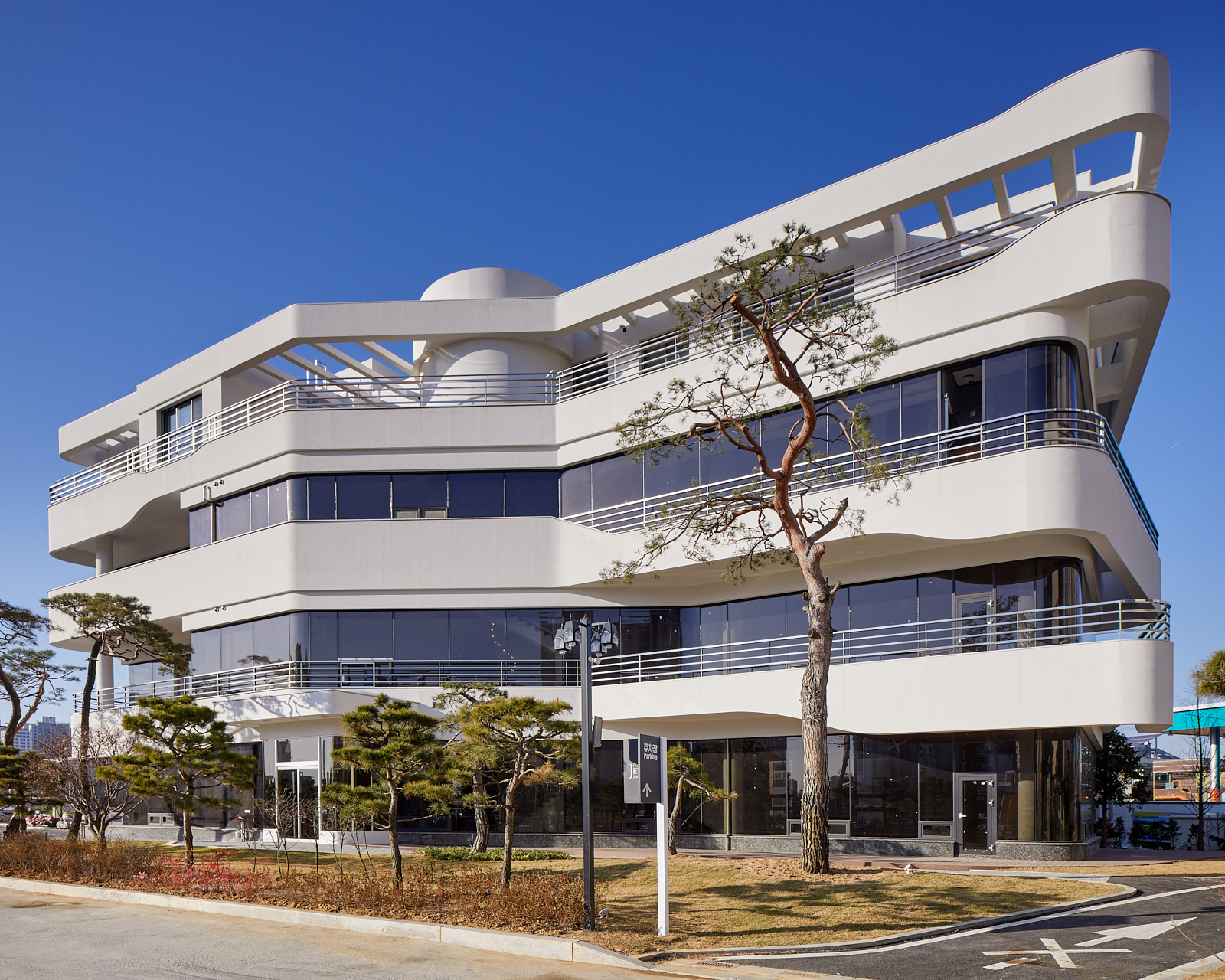건축물에 작은 움직임이 포착된다. 무기물의 고체가 아니라 꿈틀거리는 유기물의 액체인 듯하다. 직각의 모서리는 둥글게 말아져 있으며 수평적인 선이 사선으로 흐르면서 중첩된다. 흡사 정중동의 자태로 피어오르는 새벽안개 같다.