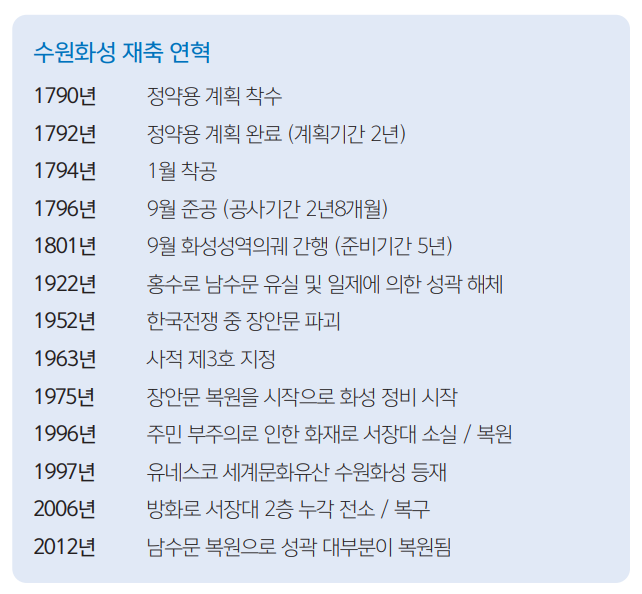 수원 화성은 1975년 장안문을 시작으로 본격적인 복원이 시작된다. 한국전쟁 때 파괴된 장안문의 실측자료가 없었기 때문에 당시까지 확인된 사진자료와 화성성역의궤의 도면이 복구의 기준이 되었을 것이다. 다시 한번 화성성역의궤의 중요성을 떠올리지 않을 수 없다. 18세기 조선에서 2년 만에 축조한 화성은 20세기 대한민국에서 20여 년 동안 조금씩 조금씩 복구된다. 신축보다 리모델링이 더 어려운 것은 현대 건축물도 마찬가지이니 충분히 이해할 수 있겠다. 1996년 정도가 되면 화성은 본래의 모습을 많이 되찾게 된다. 20여 년간 노력한 복원 결과를 바탕으로, 수원 화성을 유네스코 세계문화유산에 등재하는 준비를 가게 된다. 이때 주민의 부주의로 서장대에 화재가 발생한다. 성곽 주변을 살피고, 화성 내 군사를 지휘하기 위해 팔달산의 가장 높은 곳에 있던 2층 누각 서장대 전체가 이 화재로 완전히 소실되고 만다. 다행히도 서장대 복구는 빠르게 진행되었다. 이듬해인 1997년 수원화성은 유네스코 세계문화유산에 등재되었다.