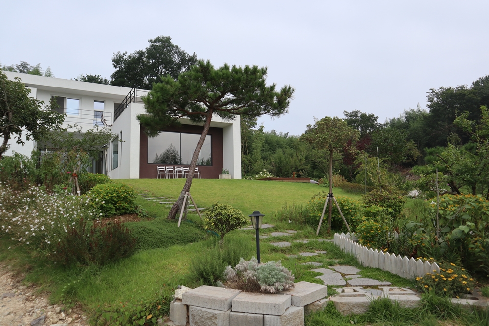 마을 끝자락에 위치한 대지는 마을 초입보다 높은 지대에 위치해 있으며, 뒤편으로 대나무 숲과 대비되는 하얀색 외관으로 인해 멀리에서도 한눈에 띈다. 또한 진입부분에는 조경공간을 조성해 건축물과 자연이 어우러진 느낌을 준다.
