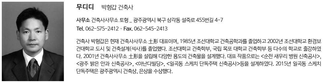 무디디 설계자 | 박형갑_건축사사무소 토형 건축주 | 탁현이 감리자 | 최순윤 _ (주)평화엔지니어링 건축사사무소 시공사 | 임관락 설계팀 | 김소현, 최선경 대지위치 | 광주광역시 남구 수춘안길 9(양과동) 주요용도 | 단독주택/휴게음식점 대지면적 | 906.16㎡ 건축면적 | 233.77㎡ 연면적 | 244.15㎡ 건폐율 | 25.80% 용적률 | 26.94% 규모 | 지상 2층 구조 | 철근콘크리트조 외부마감재 | 스톤코트 내부마감재 | 실크벽지, 수성페인트 설계기간 | 2018. 09 ~ 2018. 10 공사기간 | 2018. 11 ~ 2019. 03 사진 | 탁환일 기계설비분야 : (주)하늘천 전기분야 : (주)하늘천 소방분야 : (주)하늘천 |