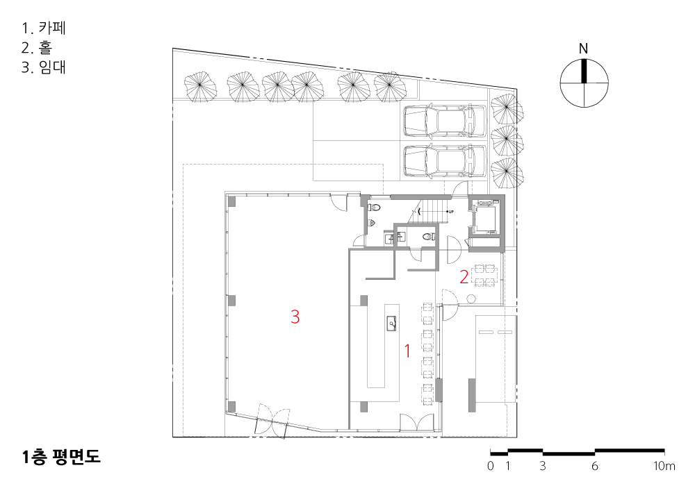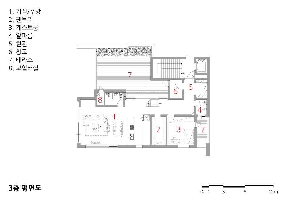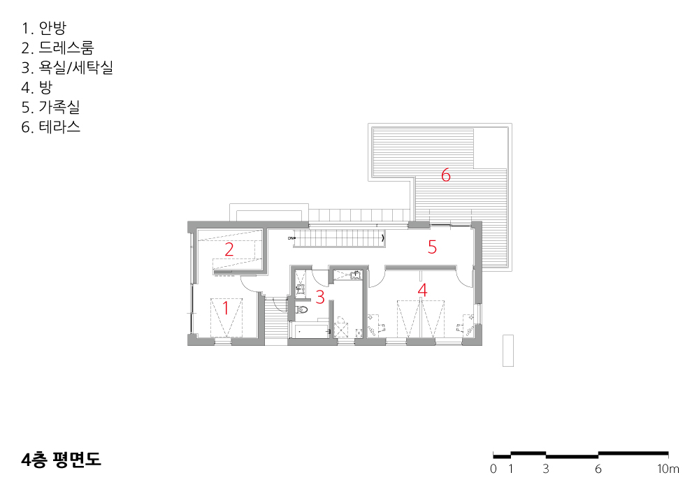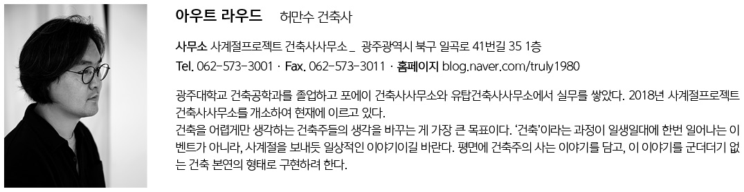 본 건물이 위치하는 곳은 광주광역시 외곽에 새로 조성된 도시개발구역이다. 흔히 어르신들이 하시는 말씀처럼 건물 계획 당시 주변은 모두 논밭이었다. 아우트라우드가 이 구역의 시작점이었다. 건물의 용도가 ‘상가주택’이기에 존재감이 드러나야 했다. 빈 도화지 같은 땅에 시작점이자 방점을 찍을 계획이 필요했다. 모두 듣고 볼 수 있도록 우리만의 ‘소리’를 내야 했다. 우리가 흔히 생각하는 상가주택 이미지와의 차별화를 중요하게 생각했다. 입면에 대한 다양한 스터디를 진행했다. 과감한 박공 덩어리를 위에 앉히고 아래는 단정한 박스 형태의 매스, 그리고 그 사잇공간에 외부 테라스를 계획하여 두 매스가 분리된 형태로 계획했다. 해가 지면 두 매스는 시각적으로 분리되어 극적인 분위기를 연출한다. 과감한 계획일수록 건축주와의 협의가 절실하다. 계획의 의도를 정성 들여 잘 전달해야 했다. 건축주의 흔쾌한 동의로 설계 과정이 모두에게 즐겁게 진행됐다. 1,2층은 상가, 3,4층은 건축주의 주거로 계획됐다. 1층은 공간을 분할하여 임대공간과 건축주의 사업장으로 계획했다. 부동산 트렌드에 맞게 건축물을 통해 다양한 수입원이 발생할 수 있도록 했다. 1층은 건축주의 카페가 먼저 자리를 잡았다. 2층의 대면적은 카페 기능의 연장선이다. 건축주의 생각을 반영하여 별도의 공간 구획 없이 넓은 공간 그대로를 두었다. 이용객의 독립된 시간과 공간을 누릴 수 있도록 여유로운 레이아웃으로 계획했다. 3층은 주거의 1층 기능으로 공적인 공간을 배치했다. 이곳의 특이점은 ‘숨어있는’ 아빠의 독립공간이다. 벽 안쪽에 공간을 숨기고 문은 벽과 동일하게 계획하여 숨겼다. 이는 사업장과 주거가 한 건물 내에 존재하기에 아빠의 숨 쉴 공간을 내어주고자 배려한 계획이었다. 3층은 주방과 거실을 배치해 손님 초대가 잦은 건축주의 사생활 노출을 최대한 줄일 수 있도록 했다. 또한 세 살과 다섯 살의 두 자녀가 주거에서 넓은 공간을 체험하며 생활할 수 있도록 했다. 층마다 각각의 테라스를 계획하여 맞벌이 부부가 시간의 구애 없이 언제든지 자녀와 외부 활동이 가능하도록 했다. 각 층마다 다양한 위치에 테라스를 배치하여 서로 다른 뷰를 즐길 수 있도록 했다. 4층으로 향하는 내부 계단은 테라스와 거실 사이에 배치하여 아이들의 또 다른 놀이터 기능을 한다. 아이들은 계단을 오르내리며 한쪽으로는 엄마가 음식 하는 모습을, 다른 한쪽으로는 넓은 야외 테라스를 바로 보게 된다. 4층은 가족의 사적인 공간으로 계획했다. 모든 일과를 마치고 가족이 함께 4층으로 향한다. 메인 욕실과 각자의 방을 배치했다. 욕실과 세탁실은 벽 대신 서로 통할 수 있는 문을 계획하여 주부 동선을 최소화했다. 성별이 다른 자녀들의 방은 가변적이다. 현재는 나이가 어리기에 두 공간의 기능을 놀이방과 침실의 기능으로 사용하고, 아이들이 성장하면 언제든지 분리하여 각자의 독립적인 방으로 쓰일 수 있도록 했다. 4층은 지붕선을 그대로 천장면으로 계획해 층고가 높고 면이 경사진 이색적인 공간을 경험할 수 있다. 좁은 복도와 각 공간의 부피감을 확장하여 실제 면적보다 더 넓은 공간감을 느낄 수 있도록 했다. 높은 천장과 면하는 벽에 창을 계획하여 항상 밝고 쾌적한 분위기를 연출할 수 있도록 했다. 주거가 단순한 ‘집’의 기능을 넘어 가족의 재미있는 놀이터이길 바라는 마음을 녹여 계획했다.
