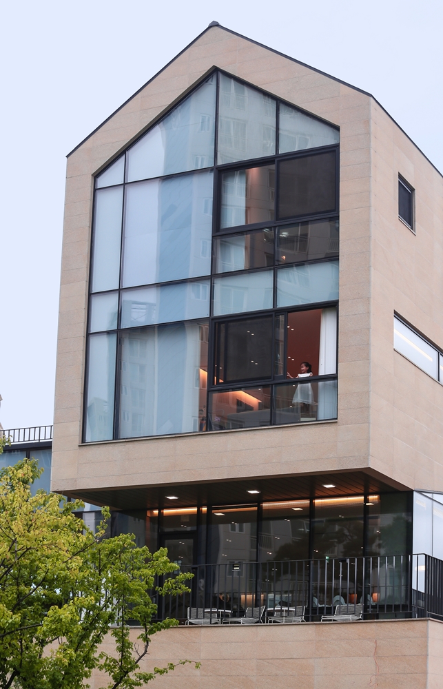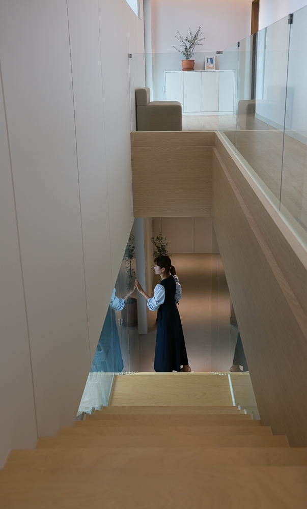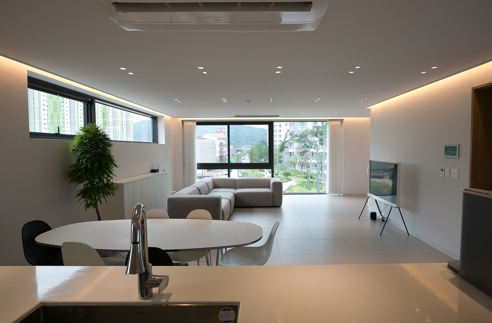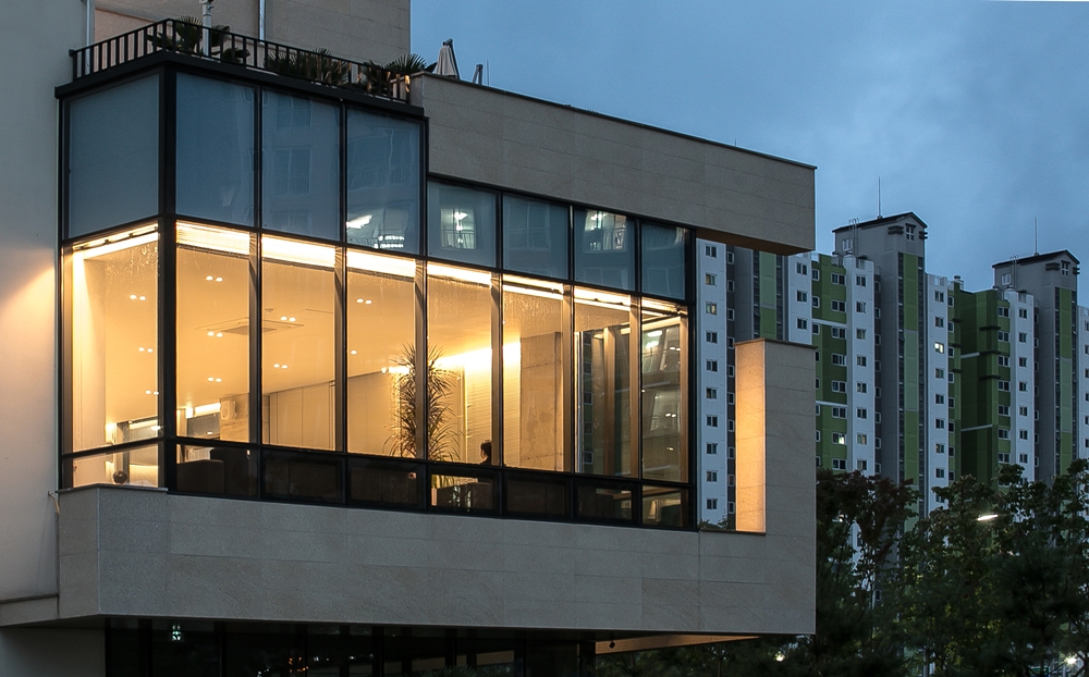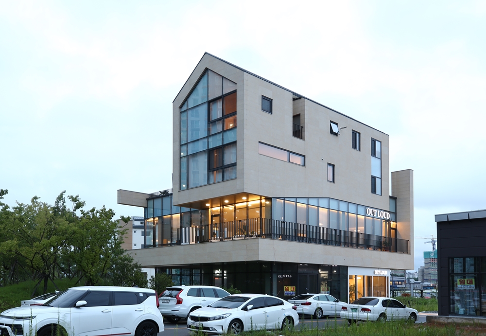 Out loud is a word that means to make sounds that other people can hear. The story of this building started with this, became a concept and a name for the building. The building is located in a newly constructed urban development zone outside Gwangju Metropolitan City. As the elderly say, at the time of planning the building, all around here were paddy fields. This is the starting point of this building. The purpose of the building was a commercial house, so its existence had to be revealed. We need a starting point and a plan to focus on a blank ground. We have to make sounds that everyone can hear and see. We thought it was important to differenciate ourselves from other commercial ones. We conducted diverse studies on standing faces. A bold gable roof was placed on top, a neat box-shaped mass below, and an external terrace was built between the two masses. When the sun sets, the two masses are visually seperated making a dramatic atmosphere. The bolder the plan is, the more urgent it is to consult with a landlord. We had to convey the intentions of the plan. With the landlord’s agreement, the process went ahead with joyfulness. The first and second floor were planned for the malls, and the third and fourth floor were for the landlord’s residence. The first floor was planned to be a rental space and landlord’s business place by dividing. In line with the real estate trend, we made it possible for the source of income to arise through a building. The landlord‘s cafe took its first place on the first floor. The huge area of the second floor is an extension of the function of it. By reflecting the landlor‘s idea, the space was left as it was without any compartments. It is planned in a realaxing layout so that visitors can enjoy independent time and space. The third floor has a public space as a function of the first floor of residence. What’s special about this place is “ hiding place ” for dad. We hid the space inside the wall and the door in the same color as the wall. Because the work place and residence exist together, we wanted to give dad a relaxing spot. On the third floor, a kitchen and a living room were arranged to keep the privacy of landlords who often invite guests and we allowed their children to experience a large space. Each floor has its own terrace to enjoy different views and it was planned for each terrace, allowing double-income couples to engage in outdoor activities with their children anytime, regardless of time. The interior stairs leading to the fourth floor are arranged between the terrace and the living room to give children another playground. Children go up and down the stairs and see their mother cooking on one side and an outdoor terrace on the other. The fourth floor was planned as a private space for the family. After finishing the work, the family heads to the fourth floor together. Main bathroom and separate rooms have been arranged. The Bathroom and a laundry room have minimized a housewife’s movement by planning a door in stead of walls so that they can communicate with each other. The rooms of children of different sexes are variable. They use the two spaces as a function of the playroom and bedroom now, and when children grow up, they can be separated and used as independent rooms. On the fourth floor, The family can experience a unique space with a high floor height and sloping sides by planning the roof line as it is. The volume of each space and the narrow corridors were expanded so that a wider sense of space could be felt than the actual area. The high ceiling and the facing wall were designed to create a bright and pleasant atmosphere at all times. The plan is based on the hope that housing will be a fun playground for the family beyond the function of a simple "home." Currently, it has become a crowded cafe and private house where "good sound" is always continued as we hoped, as the second child was born in hostess’ womb at the beginning of the plan. Through this design process, we found answers to questions about how far building plans can affect a family and people using space. I think the joy of seeing people happy is the best happiness that only architects can experience.