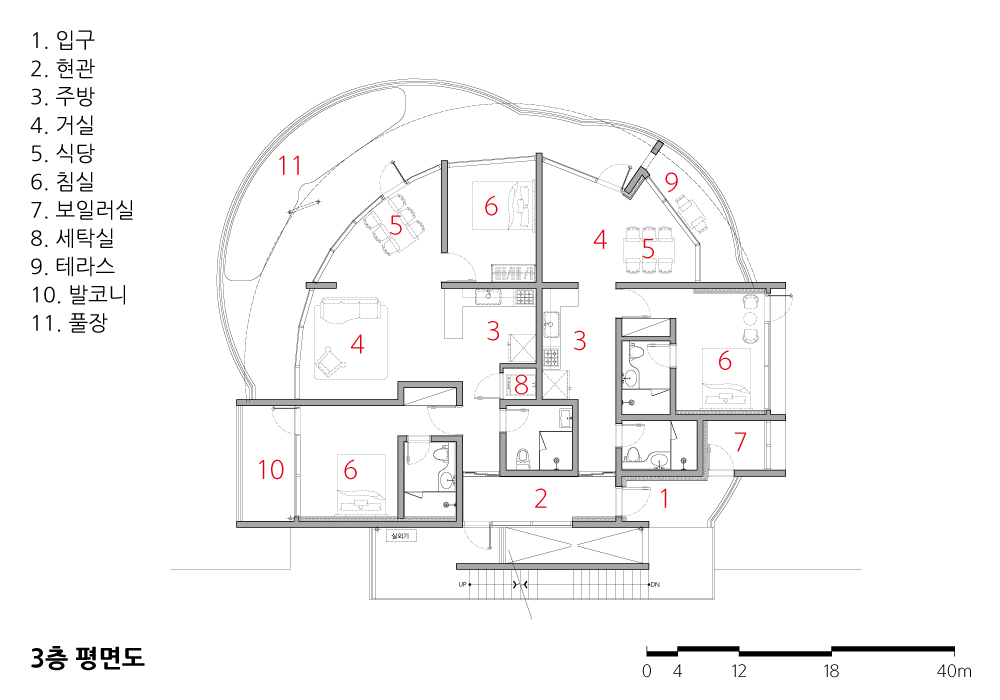 진도대교가 보이는 바다에 바로 면한 부지다. 건축주는 모든 실에서 이 경관을 바라볼 수 있길 원했고, 이를 위해 원형 파사드를 제안했다. 대신 일자로 쭉 올라가는 단순한 디자인이 아닌, 각 실의 크기와 기능에 맞게 마치 물결이 서로 겹치듯 여러 개의 원을 중첩시켰다. 1∼2층 카페는 원 형태를 따라 창을 최대한 크게 둘렀다. 3층 펜션 원형엔 사각 매스를 삽입했고, 발코니를 크게 키워 야외 풀장을 설치했다. 조형미를 살리기 위해 입면은 깨끗한 백색 스타코로 마감했다.