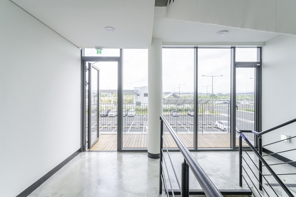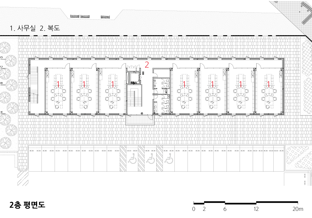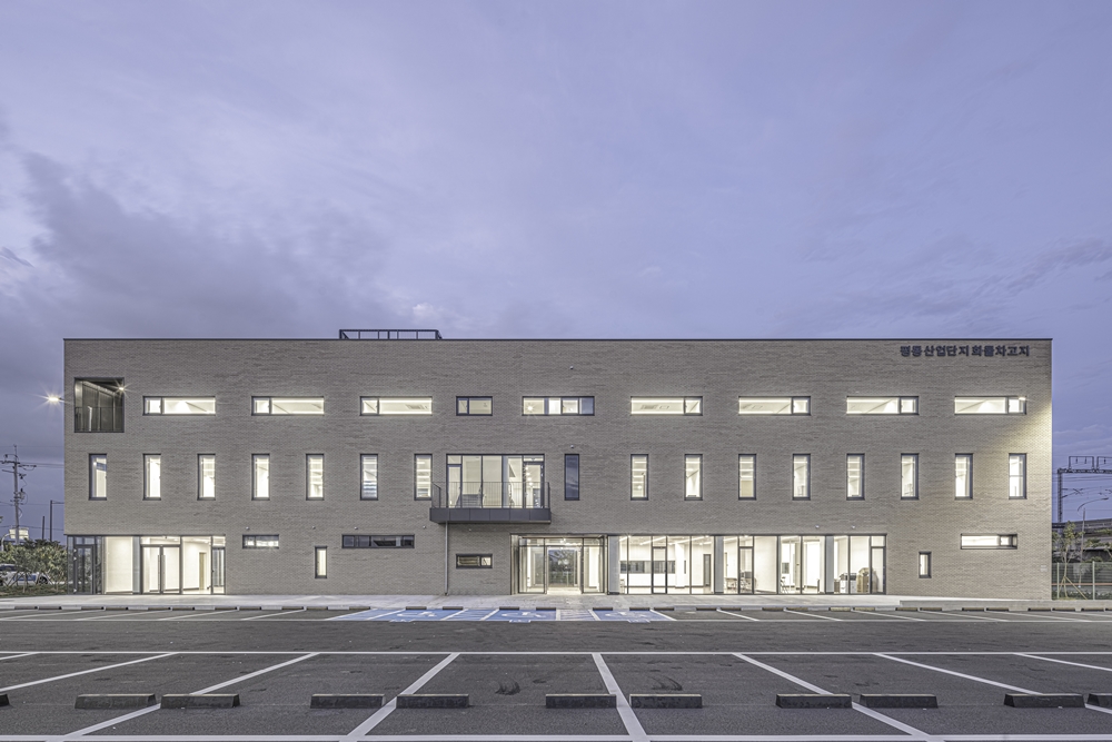 Pyeongdong Truck Garage is located in the corner of the newly created Pyeongdong 3rd Industrial Complex, so the plan focused on determining the three buildings harmoniously in an appropriate place. And I hoped that the newly built maintenance building would be warm and calm because most of the buildings in the industrial complex are finished with metal. Therefore, brickwork was selected for the exterior material of the management building. And the elevation of the building was designed to be as calm as possible. The floor plan was also designed with a long side that is not deep so that the rooms of the rental office, which are the main facilities, can be arranged through corridor access to maximize the space's comfort and usability. And each floor was designed to have a deck to relax for a while.