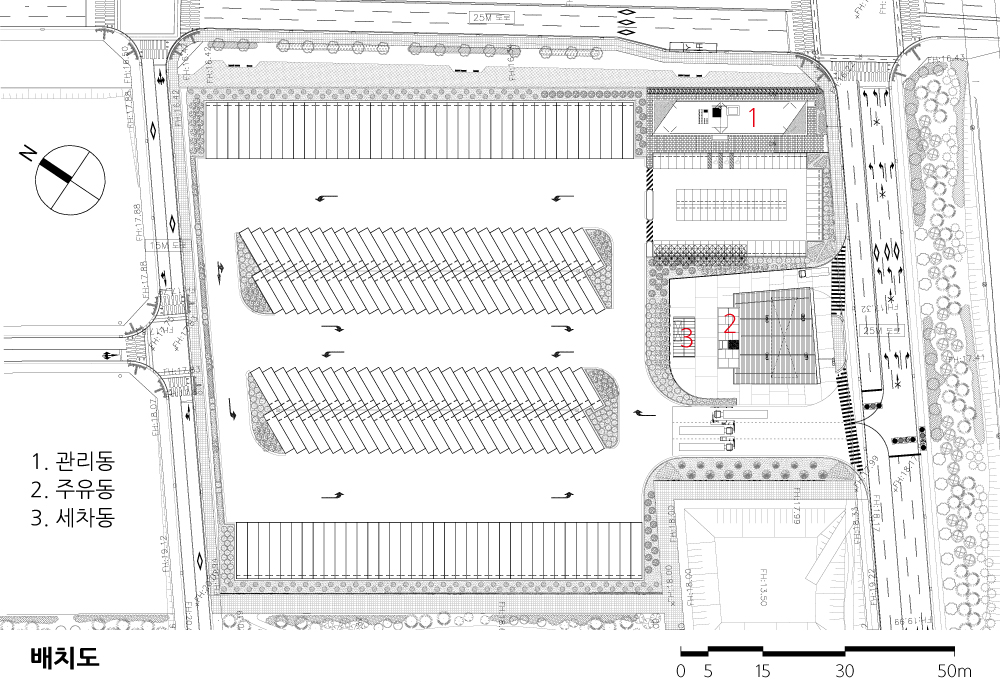 | 평동산업단지 화물자동차 공영차고지 설계자 | 신영은_건축사사무소 사람 건축주 | 광주광역시장 감리자 | 장지숙 _ 건축사사무소 해람 시공사 | (주)대광로제비앙 설계팀 | 김석의, 이재웅, 최재호, 박준석 대지위치 | 광주광역시 광산구 평동산단9번로 145 (연산동) 주요용도 | 자동차관련시설(차고, 세차장), 위험물 저장 및 처리시설(주유소) 대지면적 | 31,036.00㎡ 건축면적 | 1,378.79㎡ 연면적 | 관리동(1,486.66㎡) / 주유동(896.21㎡) / 세차동(82.80㎡) / 총 2,465.67㎡ 건폐율 | 4.44% 용적률 | 7.94% 규모 | 관리동(지상3층), 주유동(지상2층), 세차동(지상1층) 구조 | 철근콘크리트조 외부마감재 | 치장벽돌(우성벽돌 : 고갱베이지), THK3 EX. METAL, THK28투명로이복층유리 내부마감재 | 아크릴페인트, 투명에폭시코팅 설계기간 | 2016. 11 ~ 2018. 05 공사기간 | 2018. 08 ~ 2019. 08 사진 | 김성희 구조분야 : (주)서울구조이엔씨 기계설비분야 : 태인엔지니어링(주) 전기분야 : 태인엔지니어링(주) 소방분야 : 태인엔지니어링(주) |