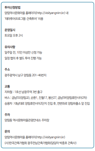 발 가는 대로 동네를 구경하는 것도 의미가 있겠지만, 역사 혹은 건축물을 자세히 알고 싶다면 건축테마투어 ‘건축가와 함께하는 양림건축여행’을 신청하는 것을 추천한다. 건축사와 건축학과 교수 등이 관광객과 함께 직접 펭귄마을과 양림동을 돌면서 건축물들에 깃든 역사와 구조 등을 쉽게 설명해준다. 양림동의 건축물들은 문화재로 지정될 만큼 역사적 사연이 깊고 다양하기 때문에 이를 알고 보는 것과 모르고 보는 것과는 차이가 있을 것이다. 지면에서는 인상적인 건축물 몇 곳을 소개한다.
