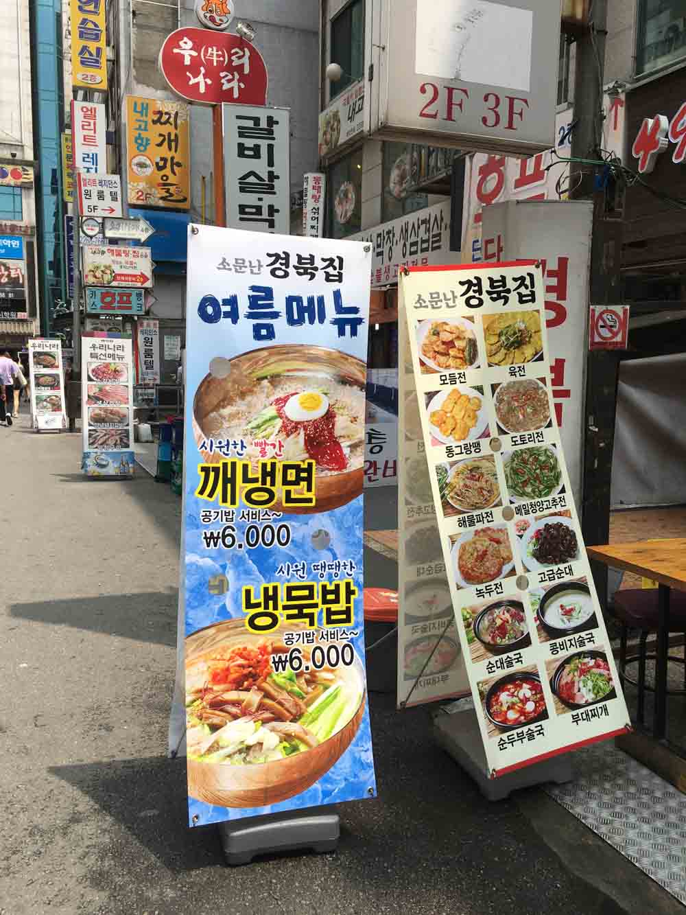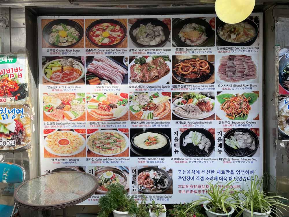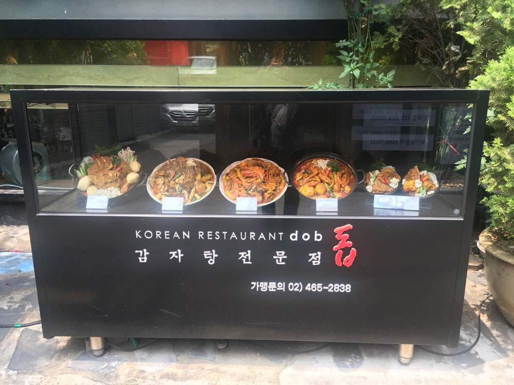 특히 외국 관광객이 많이 찾는 동네는 더욱 그런 기능을 한다고 할 수 있다. 굴국밥 사진 사진이 있고 사진 아래 영어, 한자, 일어 등으로 굴국밥이라는 캡션이 있다. 횟집에 가면 맛있게 썰어놓은 생선회 사진이 있고, 사진 아래 광어회라는 캡션이 있는 식이다. 하지만 이 사진들은 음식 정보의 전달보다는 역시 식욕 자극이 더 큰 목적이라고 봐야 한다. 정말 메뉴 정보를 알려주고 싶다면, 백화점에 입점한 음식점처럼 메뉴 책자를 입구에 비치하는 것이 더욱 효과적이다. 또는 유리 쇼케이스 안에 음식모형을 만들어 진열하는 것이 사진보다는 더욱 메뉴 전달에 적절한 방법으로 보인다.<사진 2> 그 식당이 만들어 판매하는 음식을 한눈에 다 구경할 수 있고, 가격 정보까지 알 수 있기 때문이다.