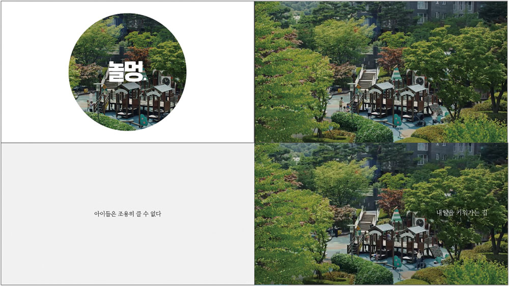 광고는 ‘놀멍.’이라는 자막으로 시작한다. 장작불을 보며 멍하게 있는 것을 의미하는 신조어 ‘불멍’이나 물이나 숲을 멍하니 바라보는 물멍, 숲멍을 본떠 만든 단어다. 노는 것을 아무 생각 없이 바라보며 고요한 마음 상태가 되라는 뜻으로 읽힌다. 놀멍할 시간을 충분히 주기 위해 영상은 인위적인 연출이나 배경음악, 광고 멘트를 모두 생략하고 40초가 넘도록 어린이들이 아파트 놀이터에서 시끌벅적하게 뛰노는 모습을 보여준다. 어른들의 소리보다 한 옥타브쯤 높이 올라가 있는 아이들의 웃음소리, 떠드는 소리 위로 ‘아이들은 조용히 클 수 없다’는 한 줄 자막이 뜬다.