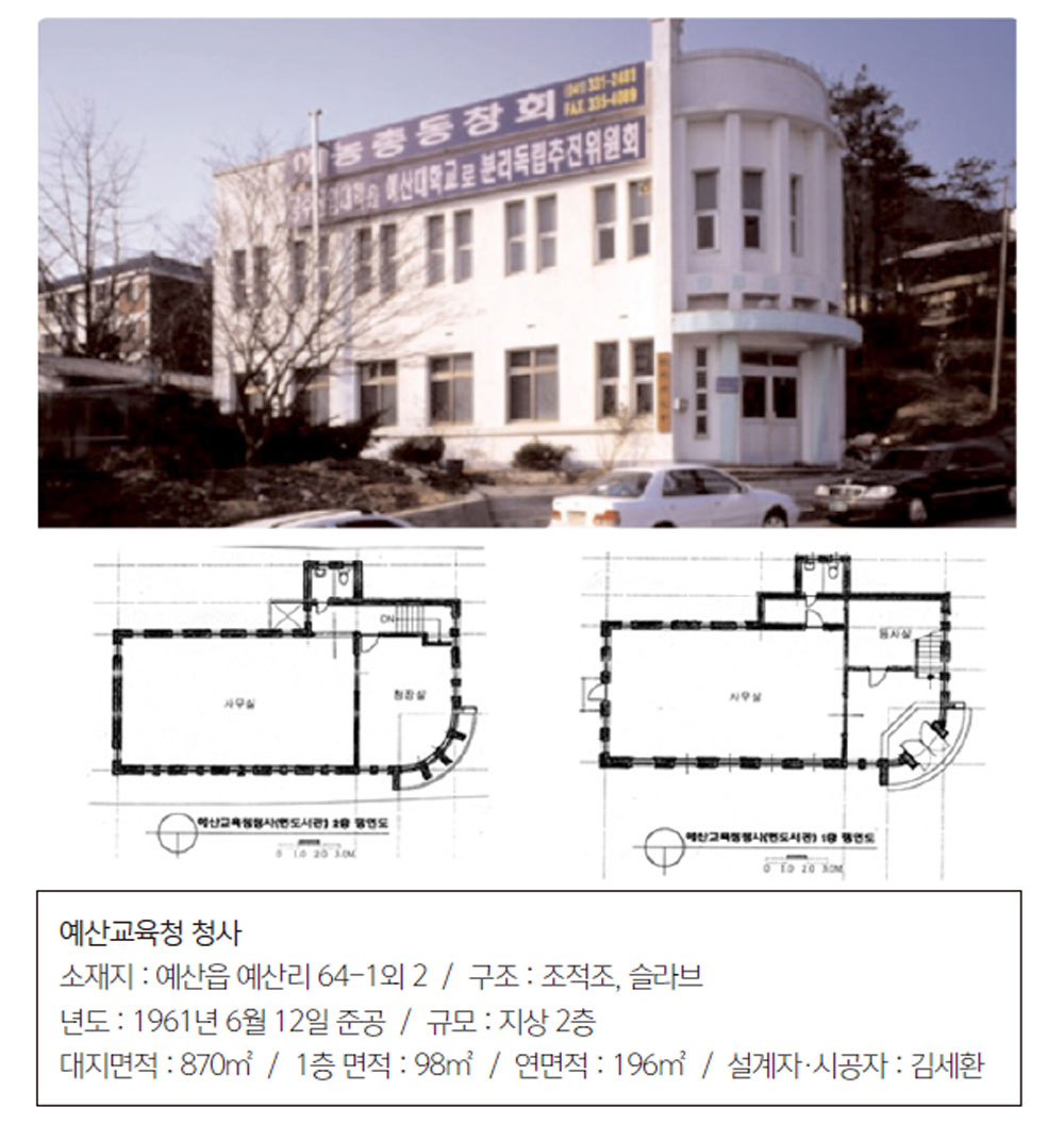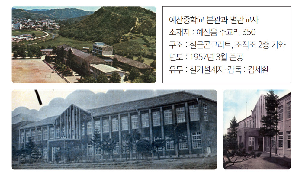 건축사 김세환은 중고 분리에 의해 예산중학교 본관과 별관(1957년 3월에 준공, 2층 조적조 건물)을 비롯하여 예산중앙초등학교 본관, 예산고등학교 본관, 예산교육청(2층 청사, 벽돌조, 1961년 6월 12일 설계), 예산농업고등학교 본관(1962년 12월 25일 준공된 3층 18교실, 철근콘크리트 건물과 연결교사 18학급), 예당토지개량조합(현 농업기반공사 예산지사, 1962년 설계, 1962년 9월 착공, 1963년 5월 준공, 지상 2층 철근콘크리트 건물), 예산문화원(1963년 준공, 조적조 2층 슬라브 건물) 등을 설계하였다.