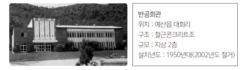 반공회관(자유회관)은 예산문예회관 건축물이 없던 시절에 유일하게 집회장소로 사용된 건물이다. 어려운 재정에도 불구하고, 이 건축물이 탄생하기까지 군민들의 성금으로 지어진 정성 들인 건축물로 비품, 의자 하나하나가 성금으로 이루어졌으며 반공의식 교육장, 크고 작은 집회장으로 이용돼왔다.