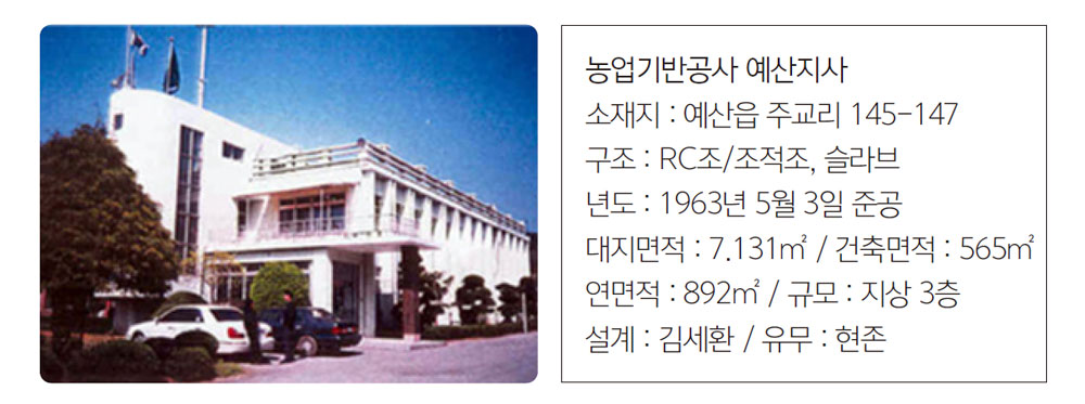 공사 중단과 재개를 거듭하여 20여 년만에 완공을 보게 된 예당저수지 축조를 해방과 더불어 중단과 6.25 전쟁으로, 4.19로 혁명을 이어 군사정부가 들어서면서 1964년에 완공을 보게 된다. 1946년 11월 예당수리조합으로 설치가 인가된 것으로 본 조합은 1962년 1월 21일 예당토지개량조합으로 개칭하였고, 예당저수지 축조 중에 본 지사 건물은 김세환의 설계로 1962년 9월에 착공하여 1963년 5월에 준공된 지상 3층 철근콘크리트조 건물로서, 그 당시 충남도청은 웅장함에 감탄하였다 한다.