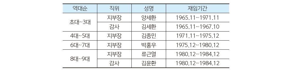* 1965년부터 1984년 9대에 걸쳐 지금의 회장을 지부장이라 하였고 총무이사를 비롯해 간사,감사,분소에 임원들이 있어 충남건축사회의 초석을 다졌다.