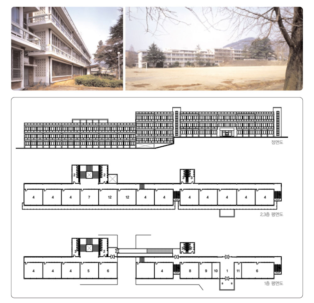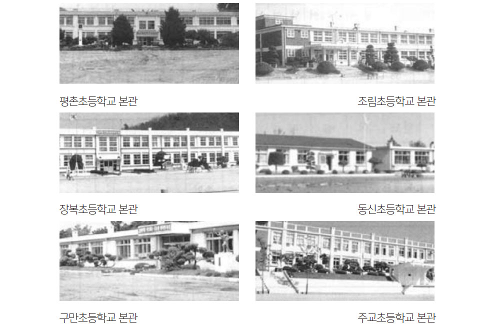 1950년대는 2층도 짓기 어려웠기에, 구하기 힘든 건축자재와 부족한 기능공 등으로 주로 시멘트벽돌로 지어진 초등학교 건축물은 1, 2 교실로 시작하여 양쪽 옆으로 연결 증축 또는 1층 위에 2층으로 증축, 자재는 주로 민군정 원조로 목재, 시멘트, 철근 등을 의존해 건축되었다. 시멘트 벽돌은 현장에서 제작한 검사제품을 신축 및 증축에 사용하여 해마다 1, 2교실식 이어온 학교다운 건축물들이다. 통학거리와 늘어나는 학생을 고려하여 주로 여름방학을 이용해 신·증축을 하였다.