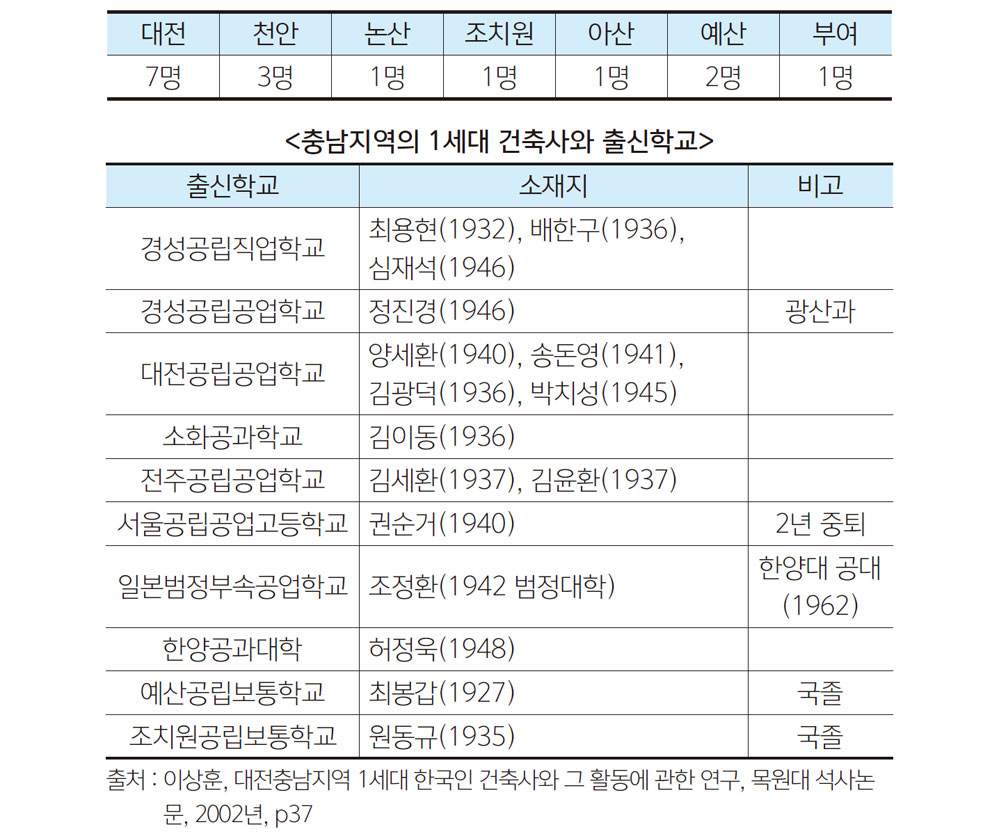 충남지방에서 해방이후 건축사의 활동은 주로 대전지역에 집중되었으며, 소읍 도시인 각 지방 도시는 1, 2명 건축사의 활동에 불과했고, 해방 전후와 6.25 전란을 거치면서 건축대서사무소가 등장하였다.
