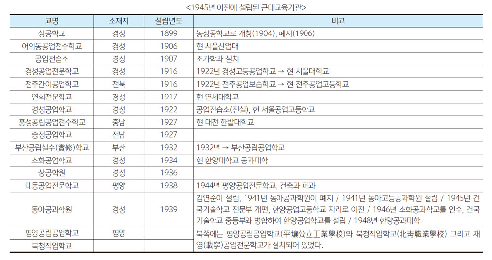 일제에 의한 건축 관련 교육의 시작은 1916년 4월에 개교한 경성공업전문학교로부터이며, 한국인 건축사들이 일제의 관공서 설계를 통해 사회로 진출하는 기반이 되었다.