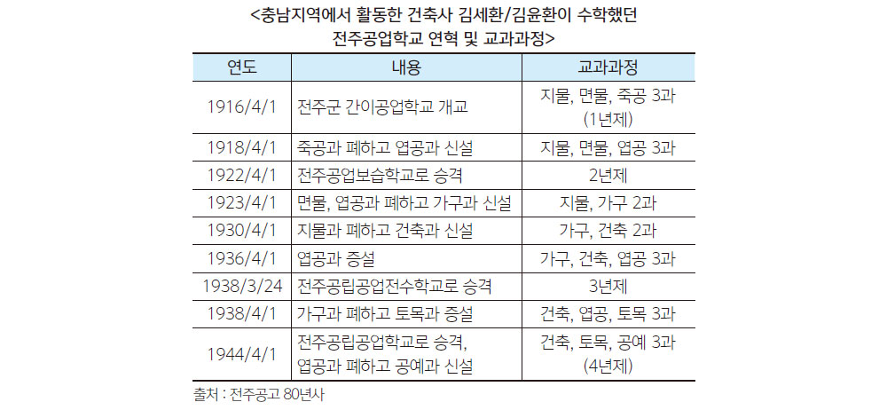 해방이후 예산지방에서 작품 활동(1950~1970)을 한 건축사 김세환(金世煥)은 일제하에 1919년 3월 1일 충남 논산군 성동면 우곤리 296(원적) 태생으로 고향에서 여유 있는 지주의 5남 4녀 중 2남으로(동생 김윤환 3남) 태어나 그는 비교적 자유로운 소년기를 보낸다. 농촌에서 4킬로미터 떨어진 강경읍에 있는 강경공립보통학교를 거쳐 1935년 전주공업학교 건축과를 동생 김윤환(金潤煥, 1921년생), 친구 김병일과 함께 입학하면서 본격적으로 건축을 수학하였고, 2년 만에 졸업한다.