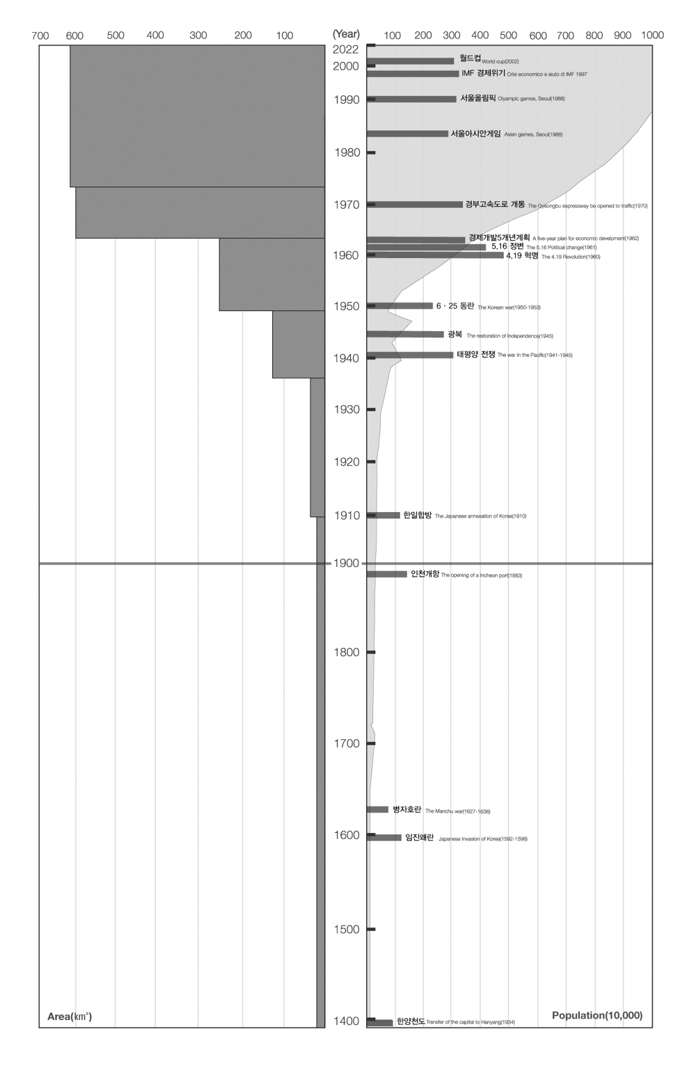 한국은 19세기까지 왕조 시대를 이어오며 형성한 고전시대의 도시들이 20세기 초 일제 강점기를 경험하며 강제적 근대화를 겪은 도시들이 산재한 대표적인 나라이다. 그중 서울은 수도로서 가장 급진적 변화를 경험하였다. 한국 전쟁 이후 국가 및 도시 복구의 시기, 경제개발 시기를 지나며 50여 년의 압축된 시간과 도시 원형 시기의 20배가 넘는 공간의 팽창이라는 이중적 상황 속에서 현재 상황에 이른 서울은 지난 100년간 동아시아를 변화시킨 역사적 과정과 도시 변화과정, 또 그 결과의 의미를 이해하는 데 필요한 모든 요소를 담고 있다.