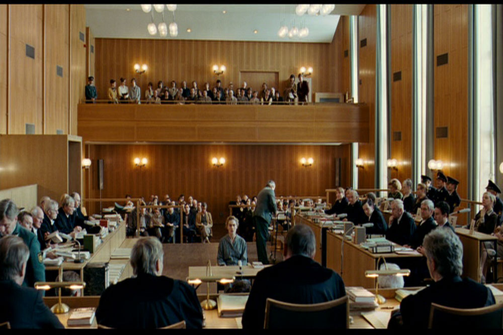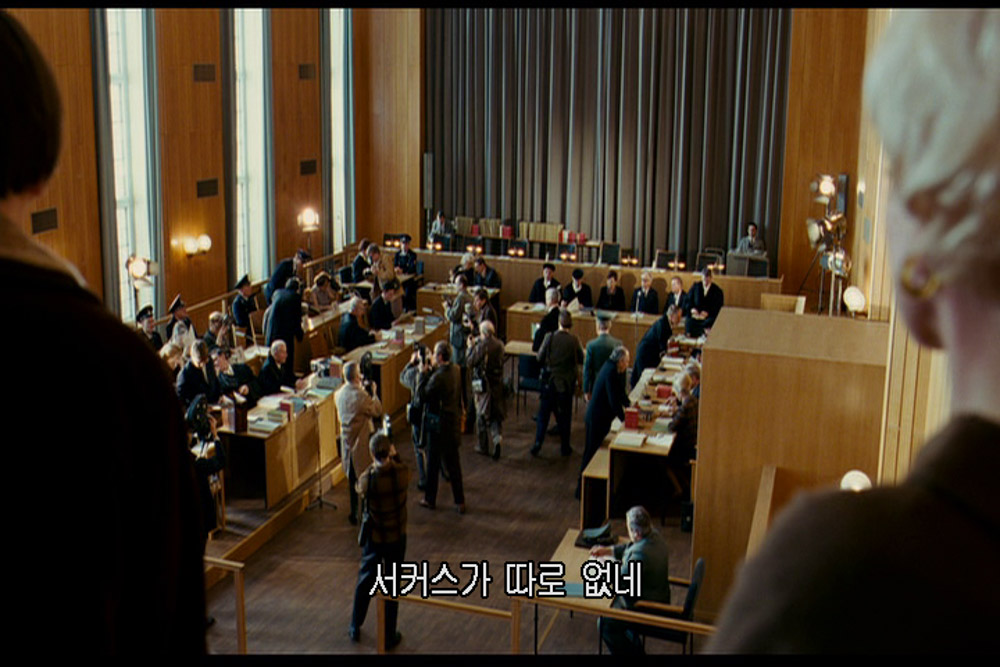 8년 후 1966년, 하이델베르크 법대생 미하엘은 륄 교수님(부루노 간츠)과 같은 과 친구들과 나치에 부역했던 피고들에 대한 전범재판을 방청하다가 여섯 명의 피고들 중 한 사람인 한나를 보게 된다. 한나는 아우슈비츠에서 유대인을 감시하는 나치친위대(SS: Schutzstaffel) 감시원(KZ-Ausseherin)이었다. 재판에서 한나가 어린이 유대인 수감자들을 불러 모아 간식도 주고, 밤마다 그녀 옆에서 책을 소리 내 읽어주게 하며 다정하게 대했다는 것과 새로운 수감자들이 오면 자리를 내줘야 했을 때 자신이 돌보았던 어린이 수감자들을 우선적으로 선발한 사실이 알려진다. 그녀는 그들이 죽기 전 한 달이라도 편하게 있게 해주고 싶었던 것이다. 2차 대전이 끝나기 직전 그녀들이 감시하던 유대인 수용소인 교회에 불이 났음에도 문을 열지 않았고, 그로 인해 수많은 유대인들이 죽었다는 사실을 추궁하자 “그것이 나의 직무였기 때문”이라고 한다. 자기의 책임은 수감자들을 감시하는 것이고, 화재 시 문을 열면 대혼란이 일어나므로 문을 열지 않았다는 것이다. 한나와 함께 기소된 다른 전범들이 “이 일은 전부 한나가 보고서를 썼다”고 모함하고, 이에 한나는 아니라고 부인한다. 재판관은 그 보고서의 필적 대조를 위해 한나에게 글을 쓰라고 한다. 보고서와 한나의 필체를 비교하려 하자 한나가 불복한다. 문맹임을 알리고 싶지 않았던 한나는 보고서가 자신이 쓴 것이라 거짓말로 시인한다. 결국 한나는 수많은 사람들의 저주를 들으며 종신형을 받고 교도소에 수감된다. 미하엘은 그제서야 책을 읽어주던 예전의 상황들을 종합하여 한나가 문맹인 것을 알아차린다. 미하엘은 한나가 문맹이라는 것을 재판부에 알릴까 하다가, 한나의 자존심이 걸린 스스로의 결정이라 여겨 포기한다.<사진 4~6>