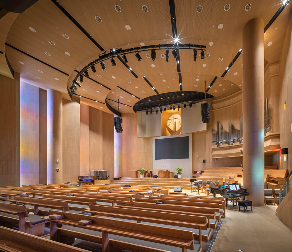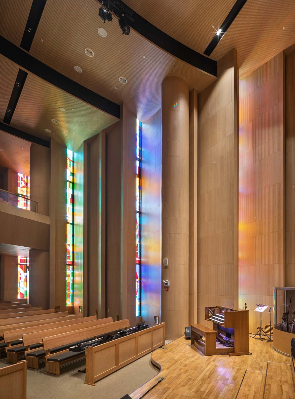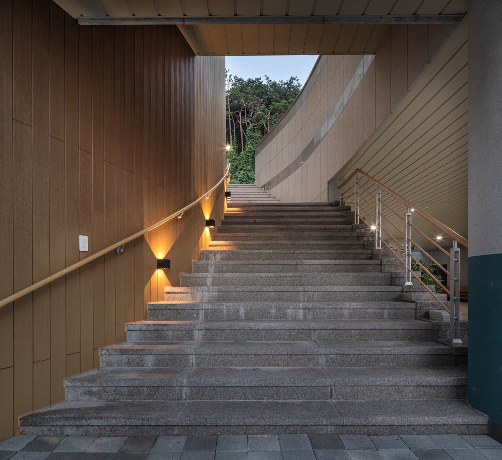 A church is designed to have beautiful yards, including a communion yard, a Carmel square, a sky garden, and a lawn yard. With a gate function that is a boundary point distinguishing between the inside and the outside in the image of the church members joining their hands in prayer under the cross, the church has an area in which the souls wounded by the world can enter the spiritual space so that they can be healed by the sword of the Spirit and blessed with God's grace, forgetting all worldly cares. Also, it has a hill where the church members can confess that they are reborn by the precious blood of Jesus before entering the place of worship through external stairs that symbolize the Way of Suffering, where Jesus walked up the hill of Golgotha while carrying his cross. The windows, which allow light from the east into the chapel through stained glass, represent the menorah, a seven-branched candelabrum. The chapel is designed to make Gwangju Nammoon Presbyterian Church a church that embraces the local community and becomes a church of love that carries out the mission of Salt & Light in the new heaven and new earth by the Ark of Salvation.