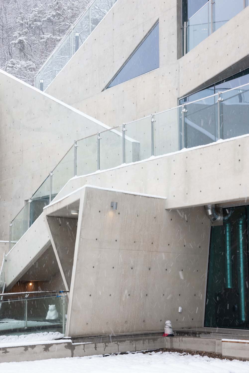 우리는 풍경을 여러 레벨과 방식으로 담아내려 했다. 본 건축물의 앞마당은 건축물을 바라보는 쪽에는 건축물의 사선 어휘로 디자인한 수공간이 있고, 외부에서 남측 풍경을 바라볼 수 있는 공간이 있다. 이 난간은 가장 단순한 난간이어야 풍경을 담아낼 수 있다고 건축주에게 얘기했었다.